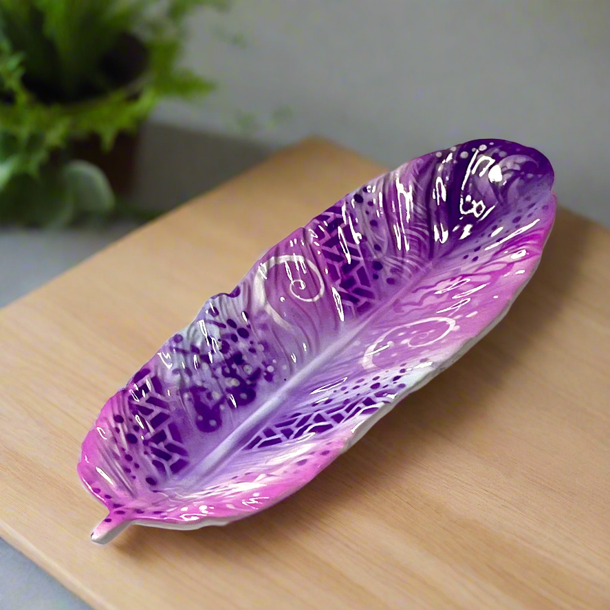 Elevate your kitchen with the NEW Fancy Feather Spoon Rest, meticulously hand poured and crafted by Cree artist White Bear. Made from food-safe epoxy resin with enchanting violet sparkles and pearl accents, this elegant piece serves as a practical holder for coffee and cooking spoons while showcasing unique artistry. Designed for hand washing, it combines functionality with refined beauty, making it an exceptional gift and a striking addition to any culinary space.