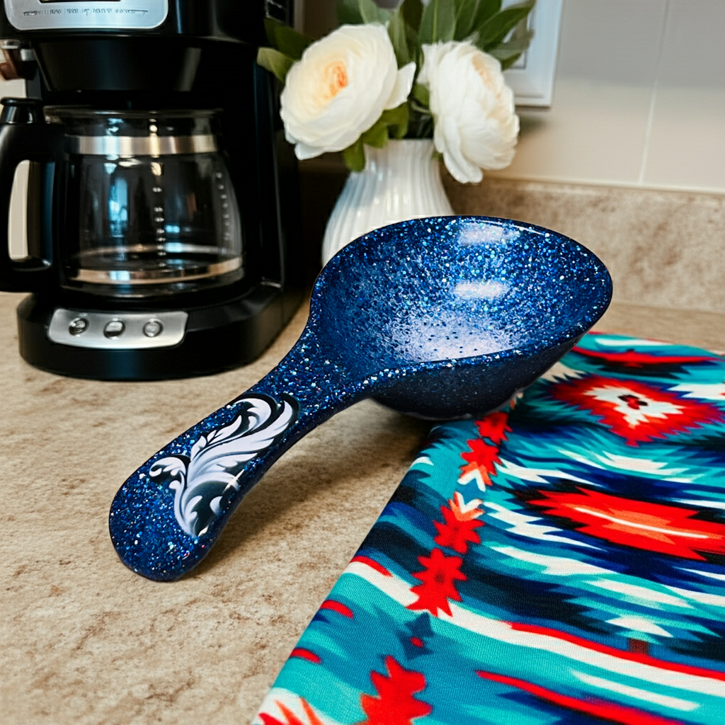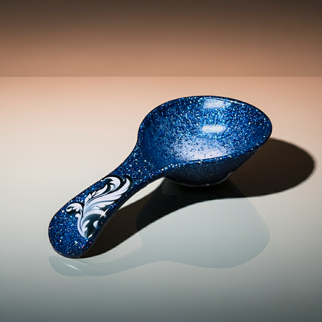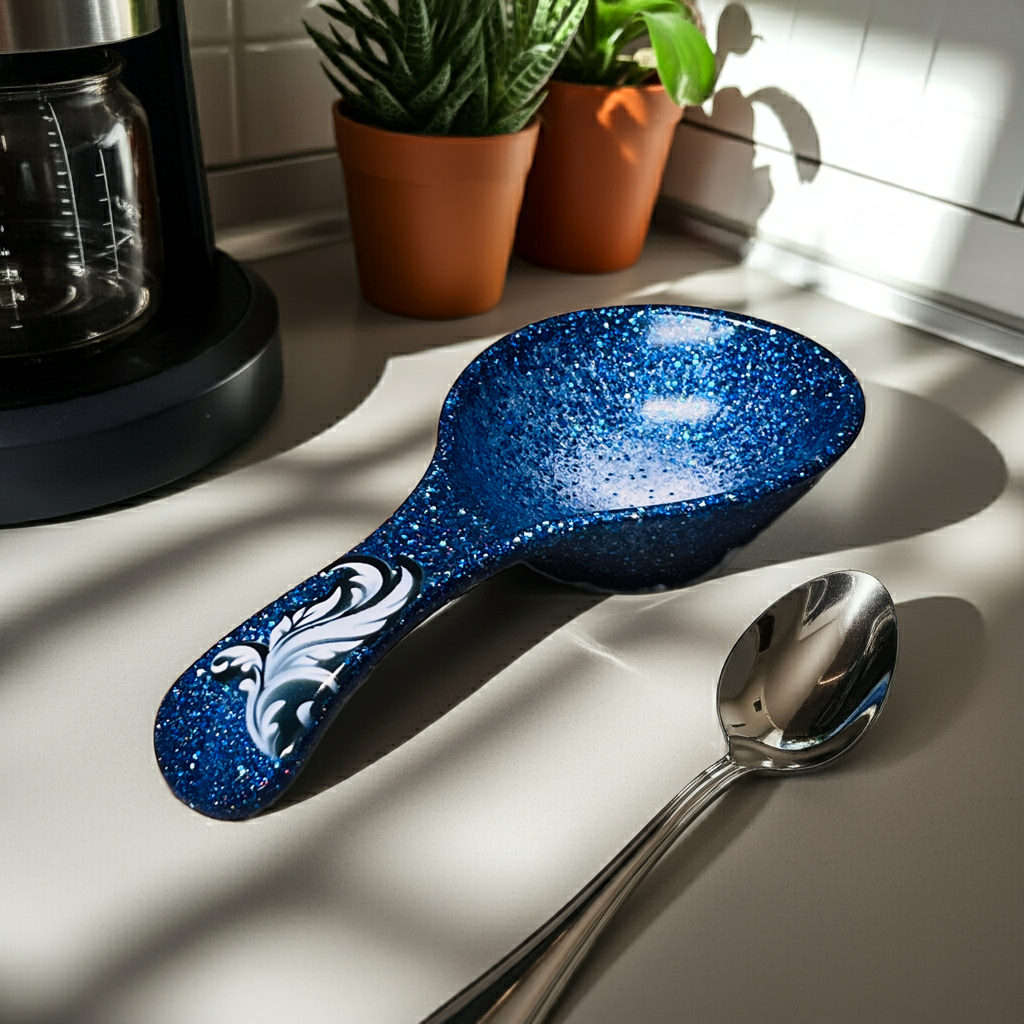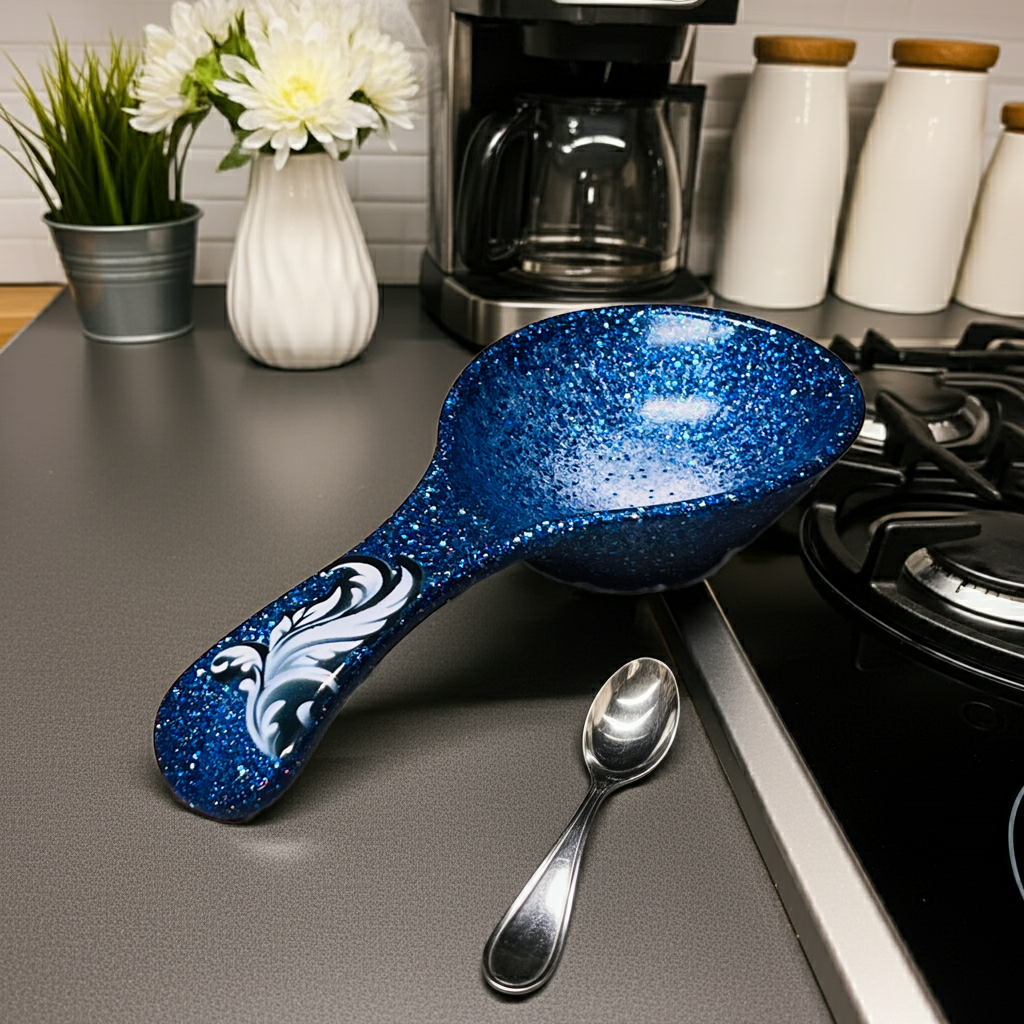 Elevate your kitchen with the NEW Fancy Feather Spoon Rest, meticulously hand poured and crafted by Cree artist White Bear. Made from food-safe epoxy resin with enchanting blue sparkles and pearl accents, this elegant piece serves as a practical holder for coffee and cooking spoons while showcasing unique artistry. Designed for hand washing, it combines functionality with refined beauty, making it an exceptional gift and a striking addition to any culinary space.