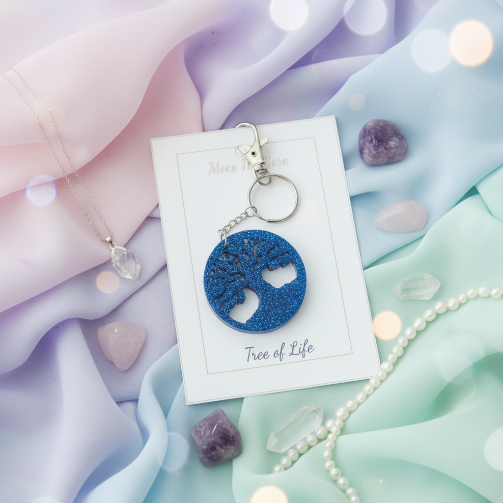 Experience refined charm with this meticulously crafted accessory. This Tree of Life keychain features a 2"x2" epoxy resin charm embellished with subtle royal blue sparkles, paired with an elegant silver heart-shaped keyring.