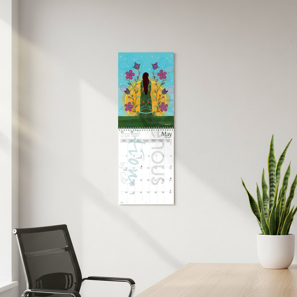 Calendar with a colorful design of a woman surrounded by flowers on a white background