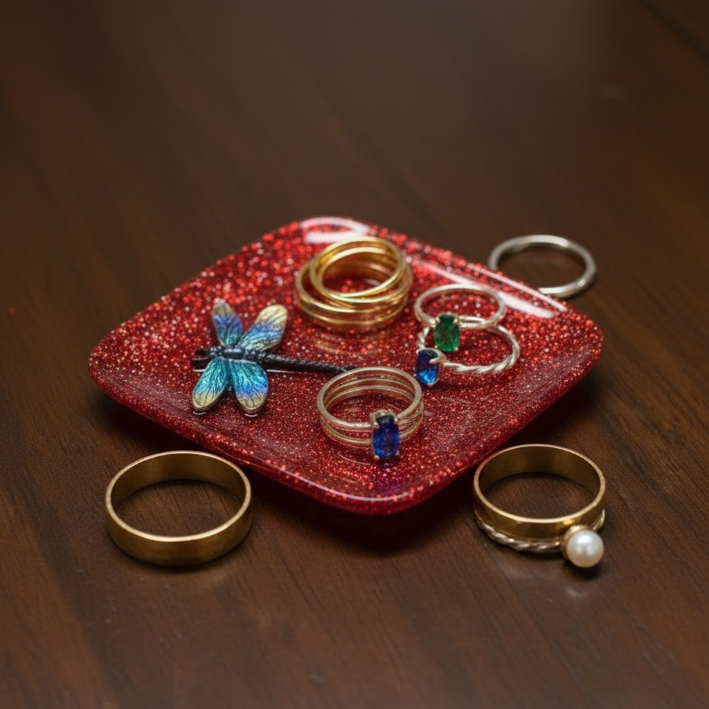 White Bear, a Cree artist at Mocs n More, hand-poured and hand-painted this epoxy resin tray in brilliant, eye-catching bright red glitter — bold, vivid, and alive with light. Every angle catches a new shimmer. At its centre, a hand-painted dragonfly carries the medicine of transformation, self-realization, and seeing beyond illusion — a symbol deeply honoured in Cree tradition. Each piece is poured individually, making yours truly one of a kind.