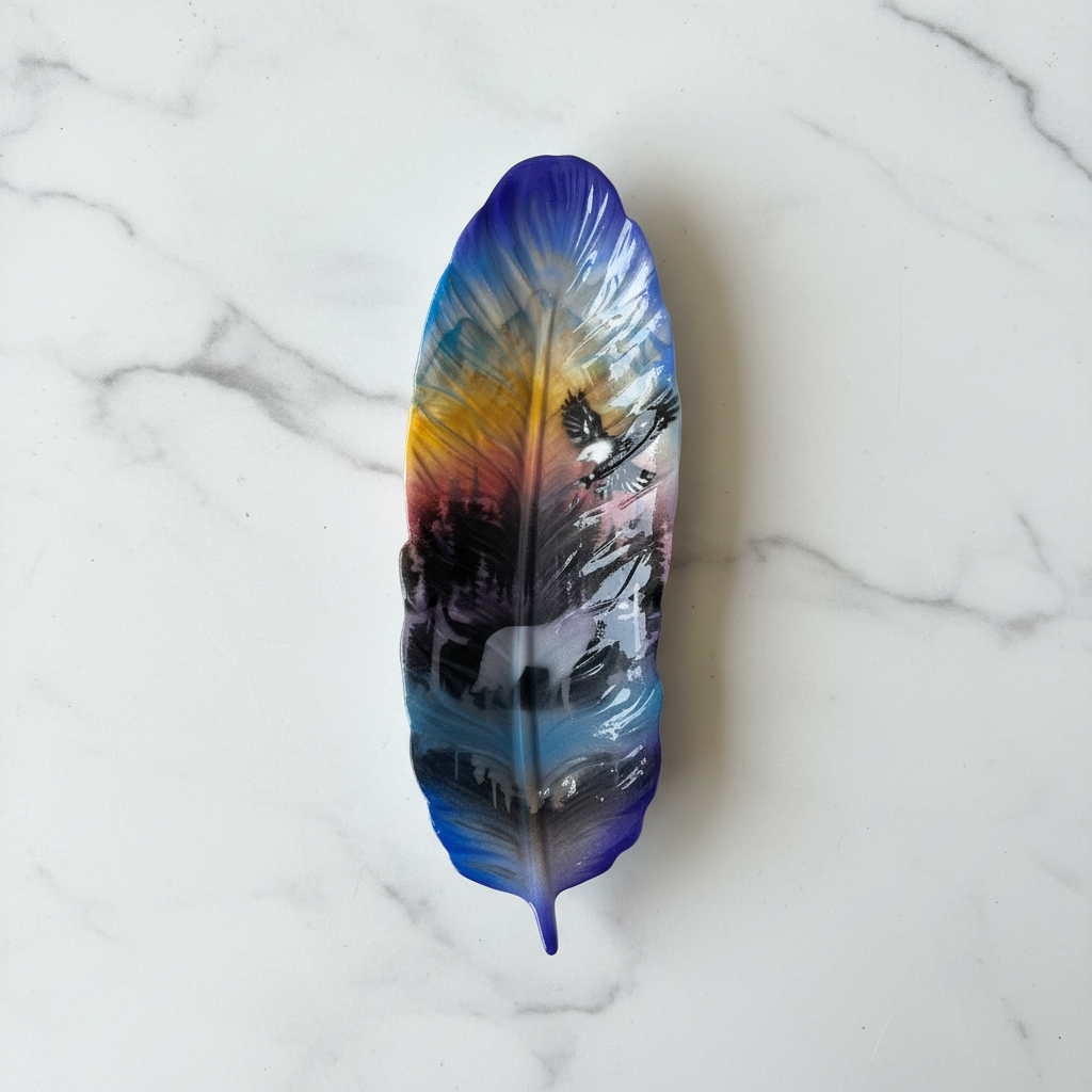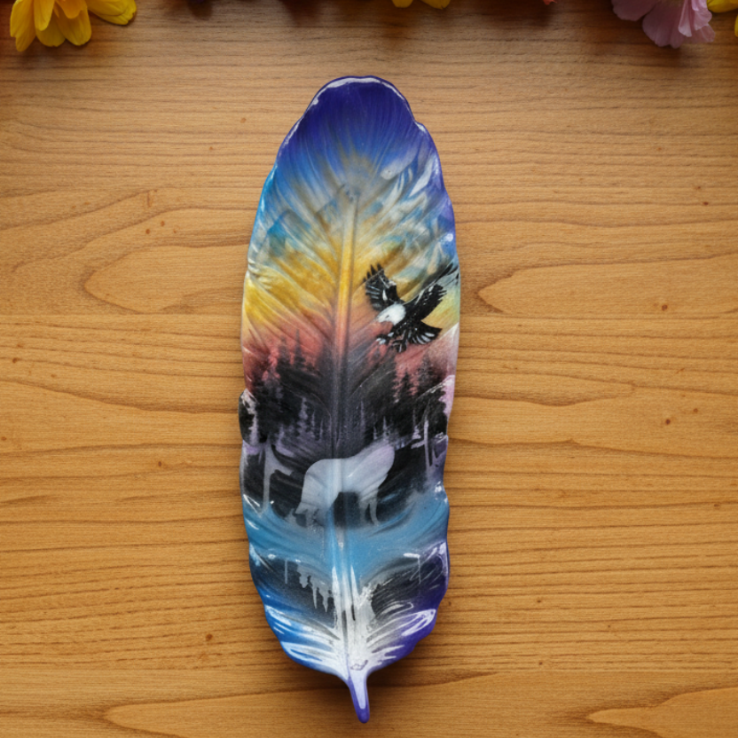 Discover the refined beauty of indigenous artistry with our hand-painted and hand-poured Feather Tray, expertly crafted by White Bear Cree artists at Mocs N More. This distinctive piece showcases a stunning nature scene featuring a majestic wolf and soaring eagle set against a backdrop of forest and mountains, all rendered in beautiful blues and yellows with touches of pink and red. The eco resin material creates a ceramic-like texture that enhances the artwork's depth and detail.