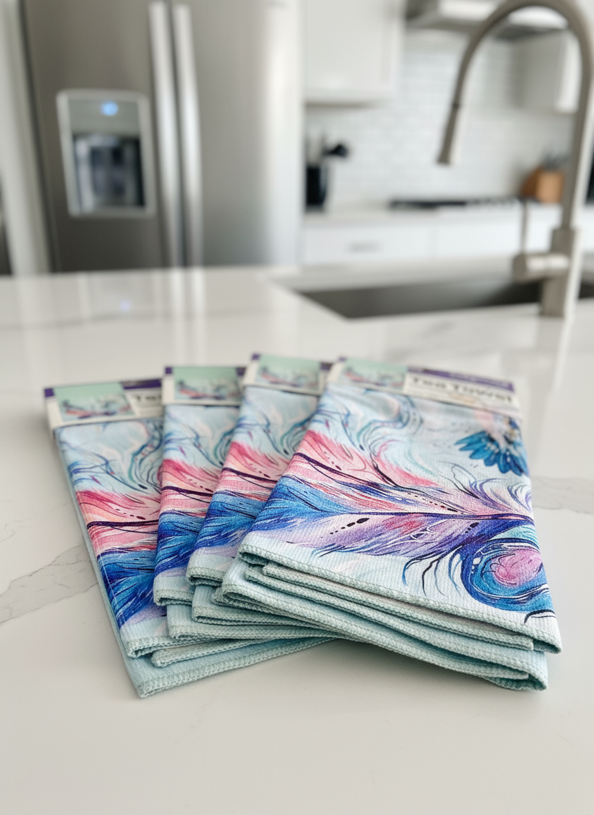 These beautiful tea towels feature authentic Indigenous artwork celebrating the delicate beauty of hummingbird feathers. Perfect for adding a touch of artistry to your kitchen while honoring Indigenous culture and craftsmanship.