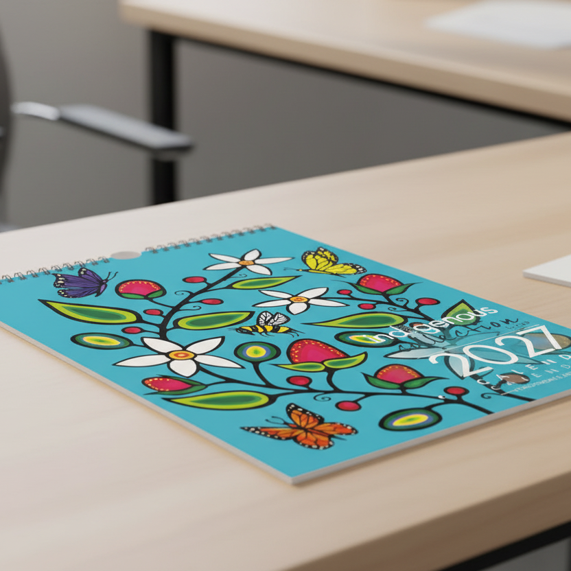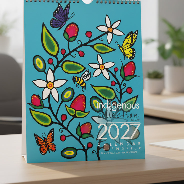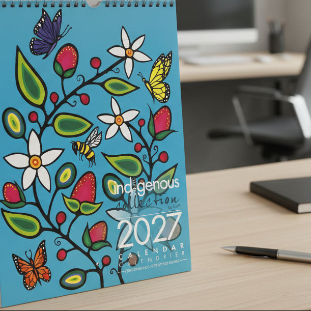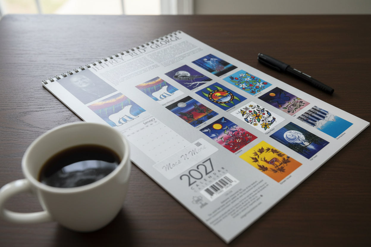 Celebrate 2027 with this exquisite wall calendar featuring the stunning artwork of Jeffrey Red George, a renowned Canadian Indigenous artist. Each month showcases a unique piece that brings cultural richness and artistic elegance to your space. Proudly printed in Canada, this calendar not only honors Indigenous creativity but also supports the artist through royalty payments on every sale. Perfect for those who appreciate art and culture, it offers a refined way to organize your year.