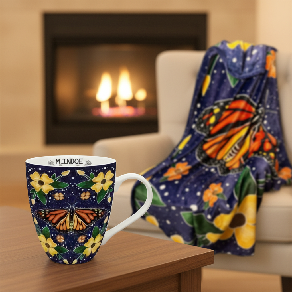 Own a piece of authentic Indigenous art with this striking 18 oz mug showcasing celebrated Indigenous artist Marissa Indoe's captivating Monarch Butterfly design. The artist's signature is printed inside the mug — a mark of authenticity that makes every sip special. Your purchase makes a real difference — royalties go directly to the artist, supporting Indigenous creators and their communities. Each mug comes in an elegant gift box with the artist's bio on the back, making it a thoughtful and exclusive collector's gift. Microwave and dishwasher safe. Designed in Canada with heart and soul.