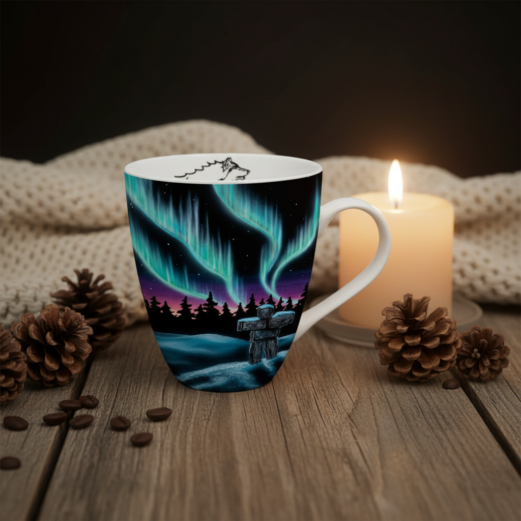 Indulge in luxury with our 18 oz Signature Mugs featuring stunning Sky Dance Inukshuk designs. Made of fine china, these mugs are both microwave and dishwasher safe for your convenience. Each mug comes in a gift box with the artist's bio and signature, making it a unique and exclusive piece. Designed in Canada, this collection supports local Indigenous artists with every purchase.