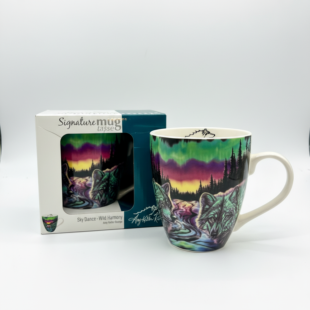 Introducing our exquisite 18 oz Signature Mugs — Sky Dance - Wild Harmony by Amy Keller-Rempp. Crafted with fine China, this mug showcases an authentic Indigenous design, while supporting the artist with a royalty. Microwave and dishwasher safe, designed in Canada, each mug comes in a gift box with an artist bio and signature on the back. Elevate your coffee experience with a touch of culture.