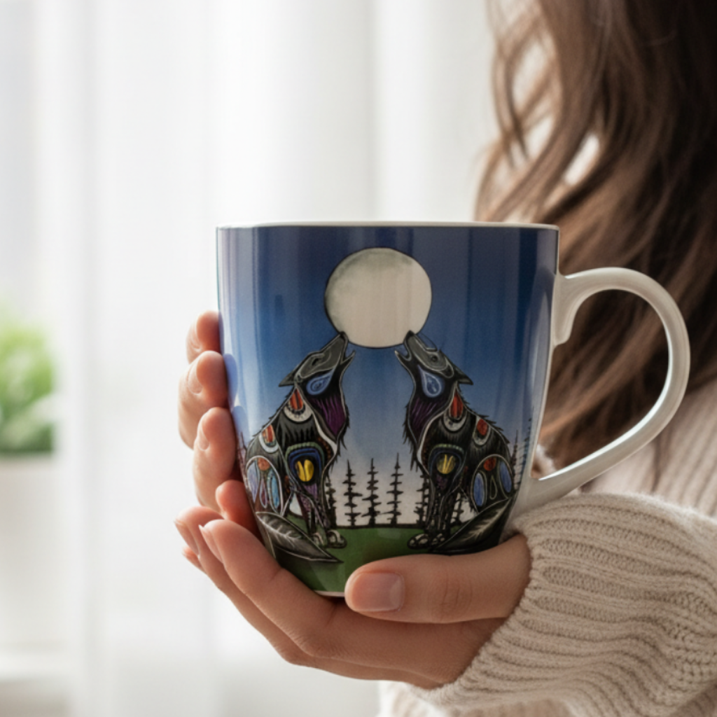 Indulge in our 18 oz Signature Mug - Howling Duo, and adorned with authentic Indigenous designs and crafted from fine China. Not only are these mugs microwave and dishwasher safe, but they also support and compensate Indigenous artists. Each mug comes in a gift box with the artist's bio and signature, making it a thoughtful and exclusive gift. Designed in Canada with heart and soul.