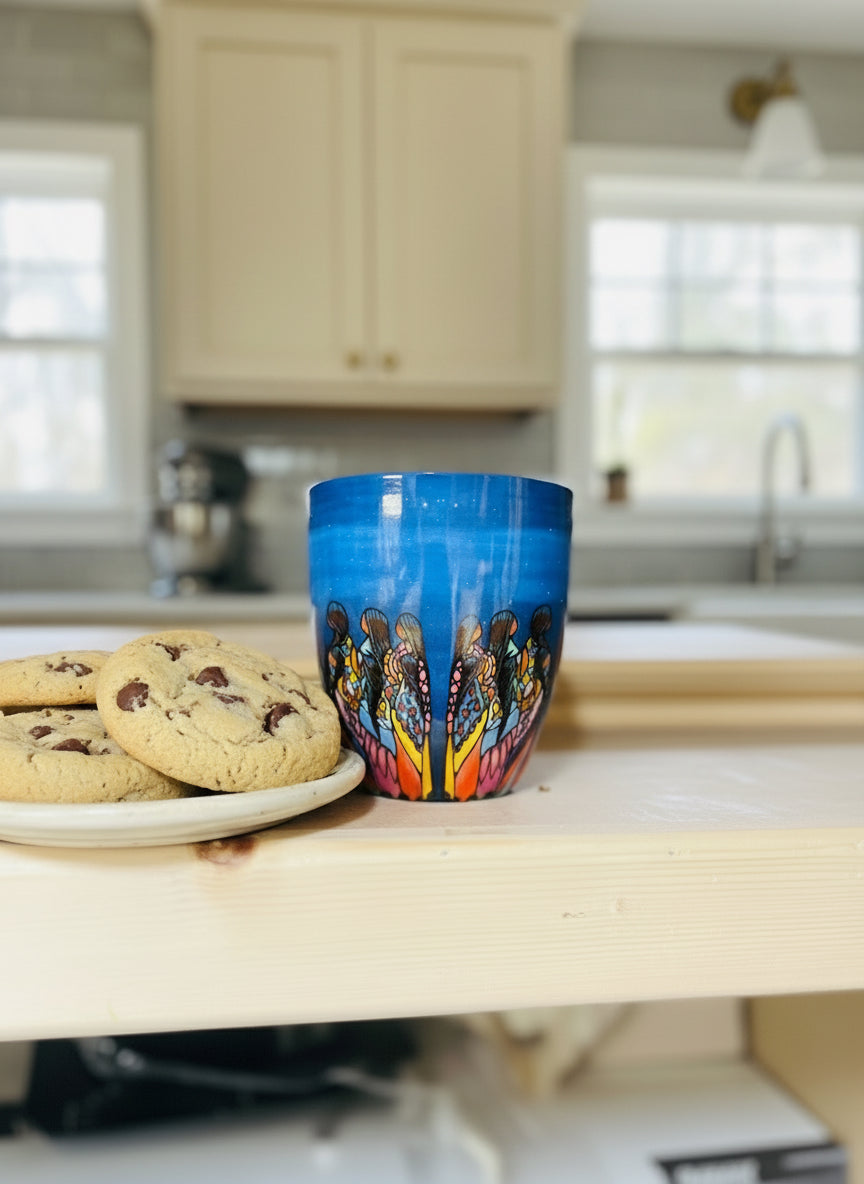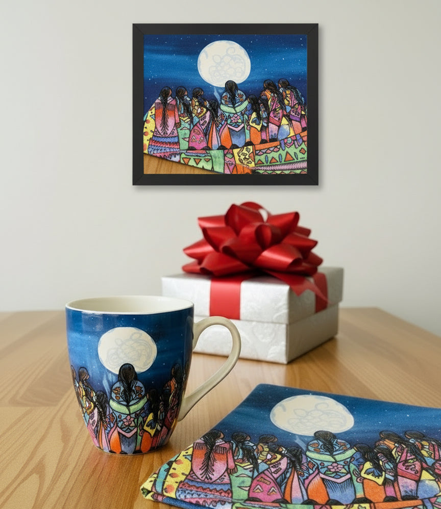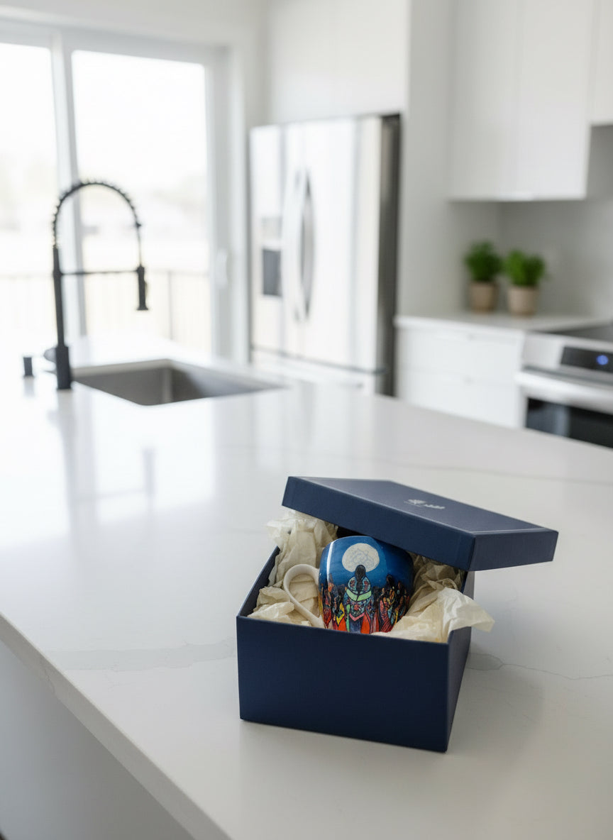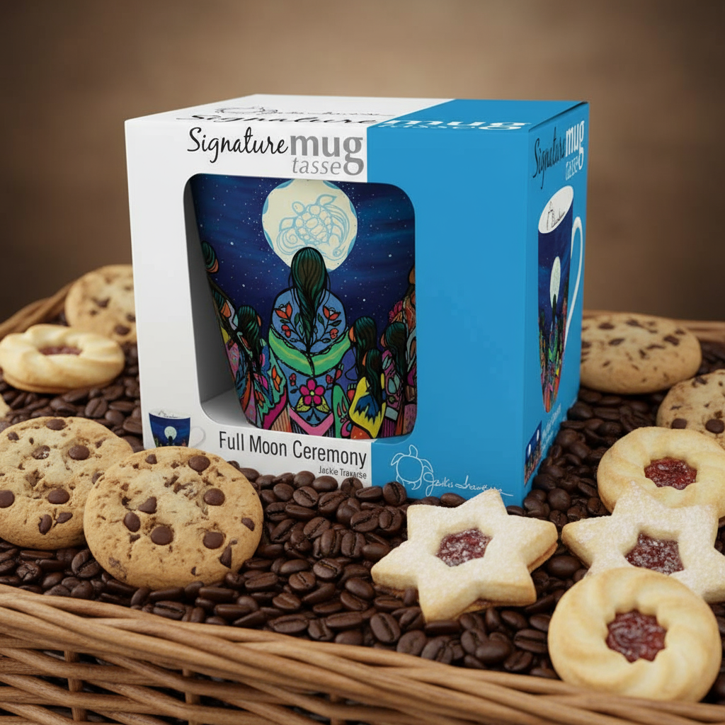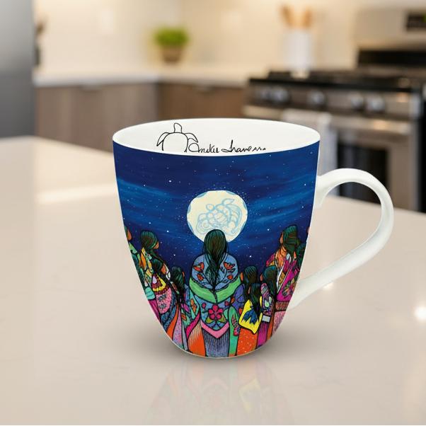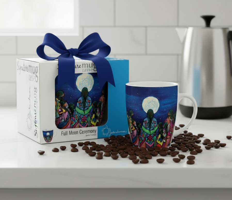 Elevate your daily ritual with our 18 Oz Signature Mug, showcasing Full Moon Ceremony by acclaimed artist Jackie Traverse. Crafted from fine China, this sophisticated vessel seamlessly transitions from microwave to dishwasher with effortless care. Each piece arrives in an elegant gift box accompanied by the artist's biography and authenticated signature on the interior—a testament to genuine Indigenous artistry. Celebrate cultural heritage and directly support emerging talent with every sip. Order four items to receive $5.00 off your entire purchase.