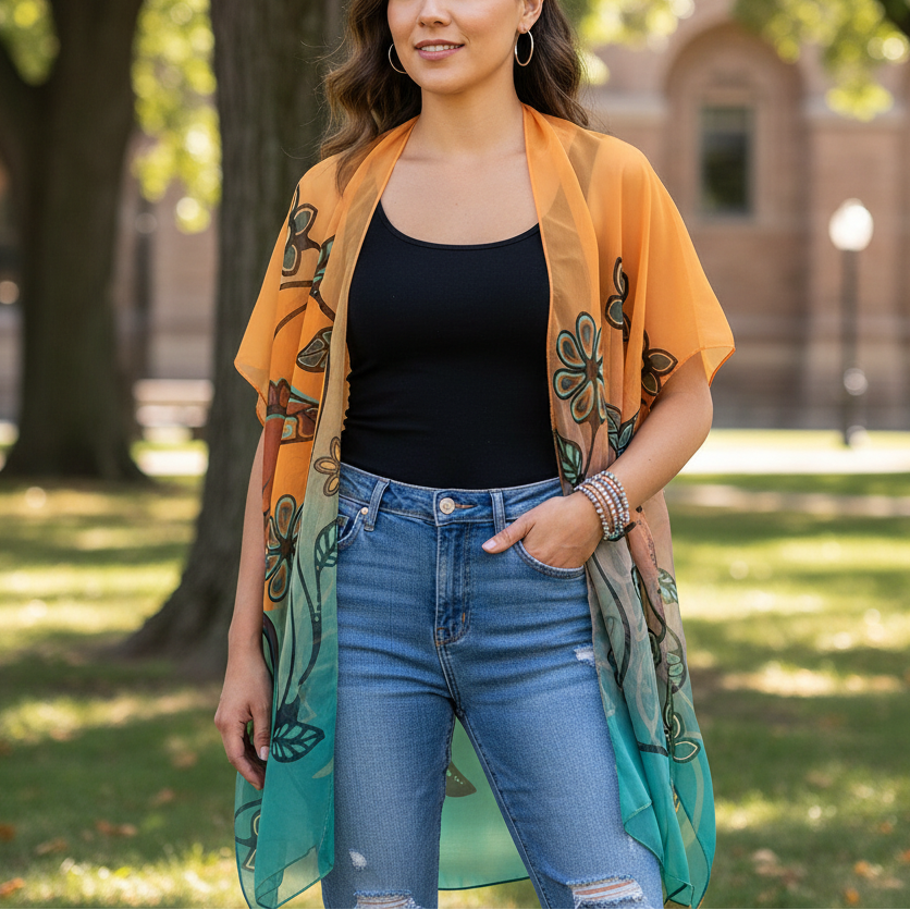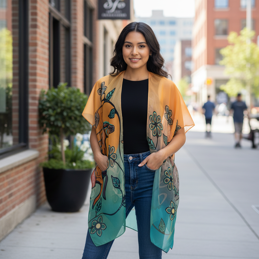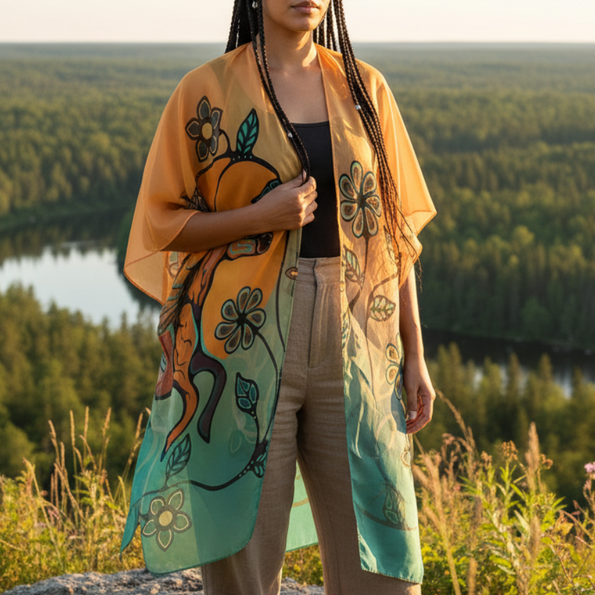 Made with soft, silky sheer fabric for ultimate comfort and flow. One-size-fits-all design for seamless sophistication. Printed in Canada with artist royalties paid directly to Storm Angeconeb, ensuring you're supporting Indigenous artists and their communities with every purchase.
