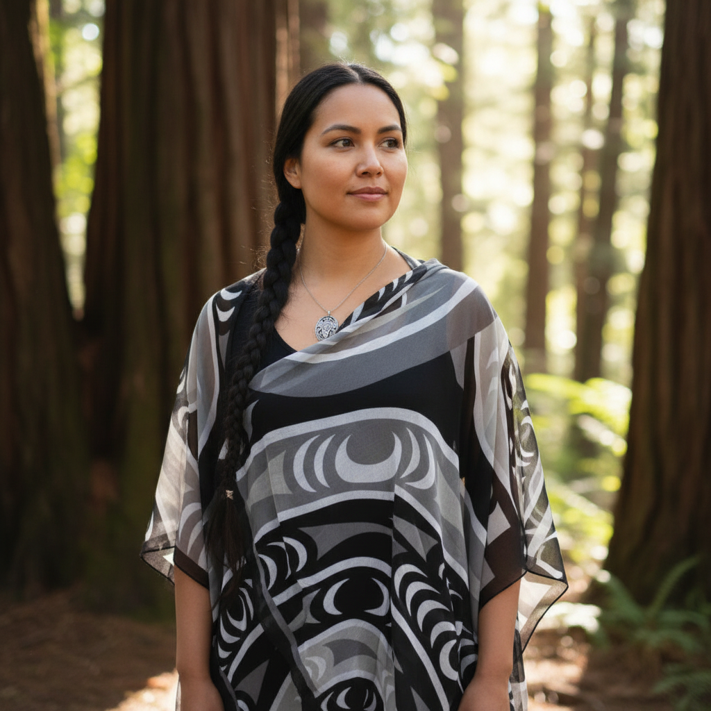 Experience elegance with this stunning Life fashion wrap designed by Coast Salish artist lessLIE. This beautiful design celebrates the interconnectedness of all living things and the sacred circle of life in Indigenous culture.