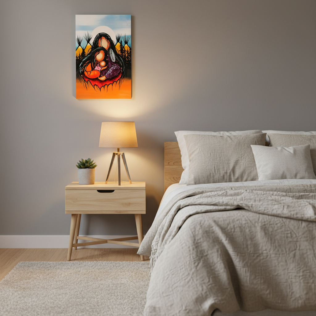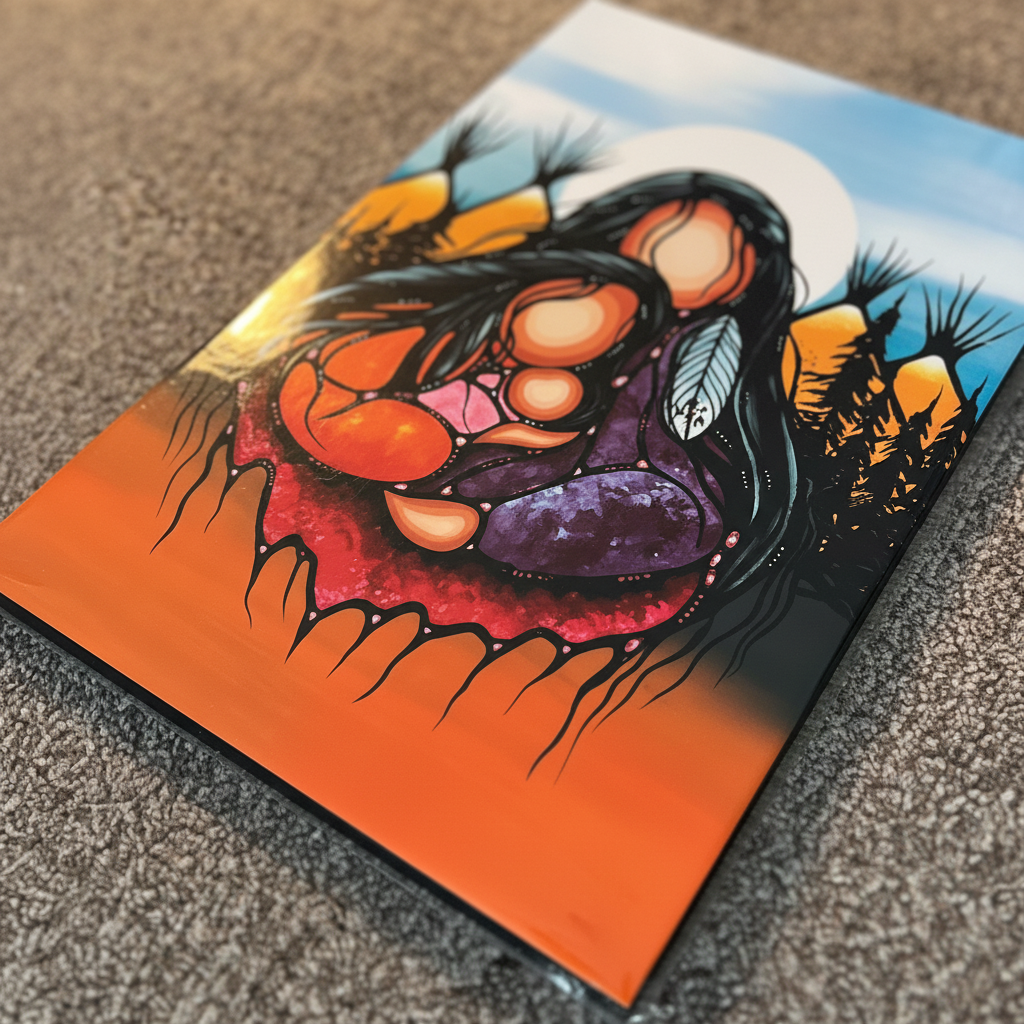 Constructed with a durable MDF shell and lightweight foam interior for easy hanging. The 12" x 18" size with 1" thickness creates a striking statement piece with a sleek black edge that beautifully frames the artwork. Features the artist's biography on the back, honoring authentic Canadian Indigenous artistry. Perfect for living rooms, offices, or sacred spaces.