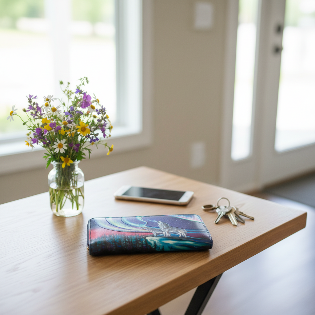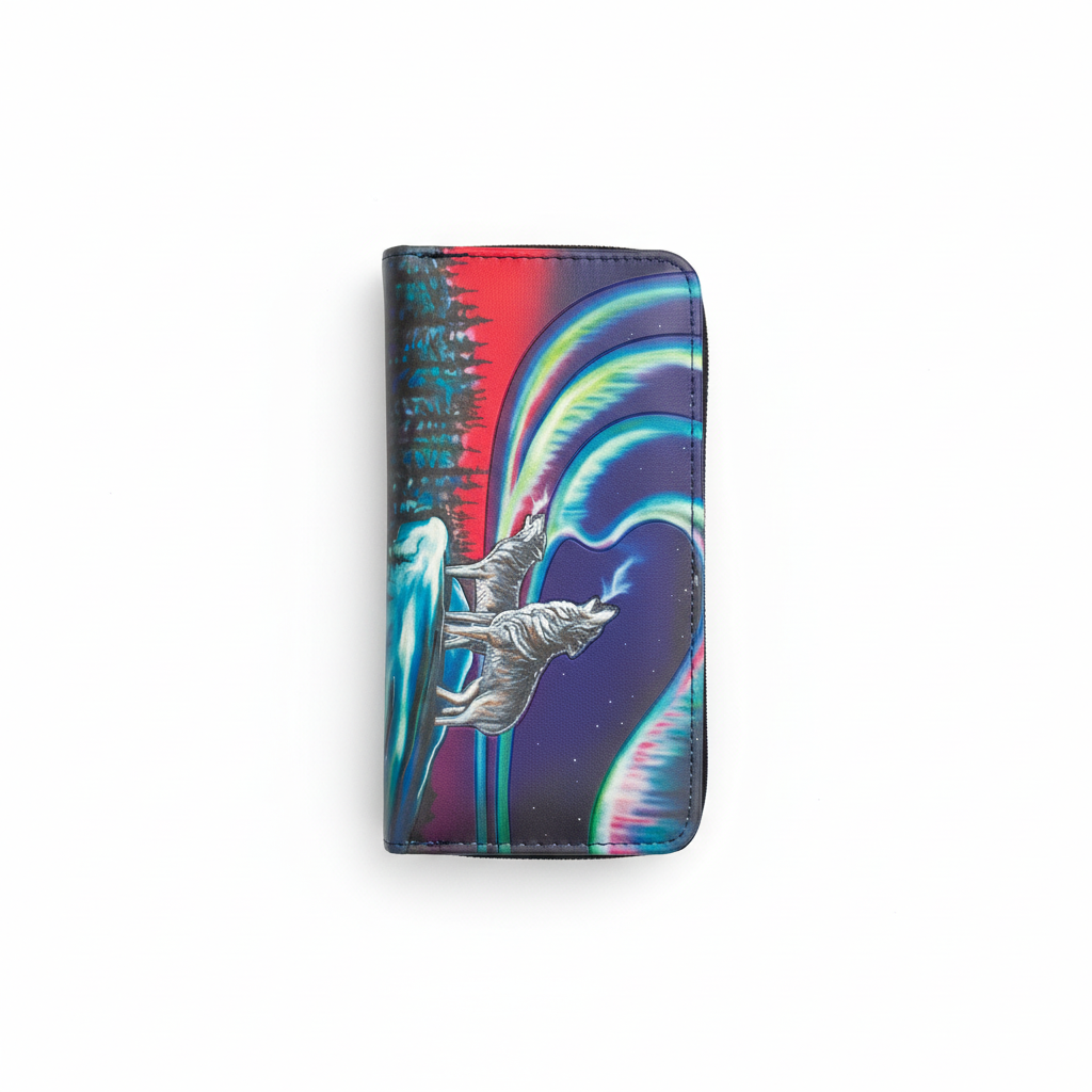 Carry the beauty of Indigenous art with you every day. This stunning wallet features the Sky Dance Wolf Song design by artist Amy Keller-Rempp, beautifully embossed on both sides.