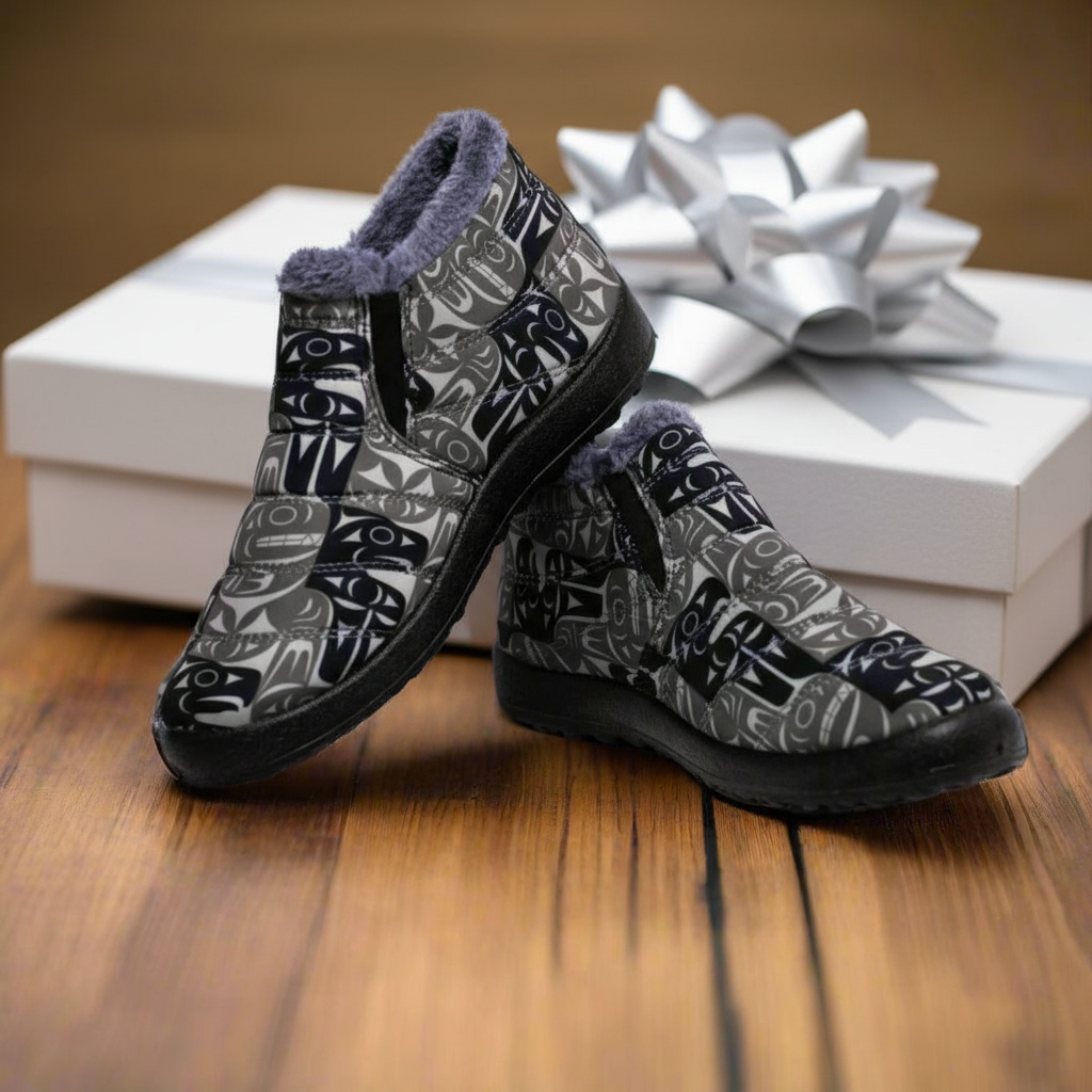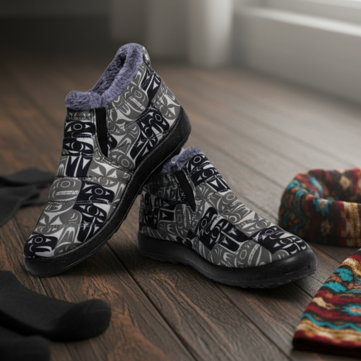 The Thunderbird symbolizes power and protection, while the Whale represents wisdom and family. Together, these sacred symbols create a meaningful design that honors Indigenous storytelling traditions. The water-resistant shell keeps your feet dry in wet conditions, while the plush lining provides warmth during cold weather.