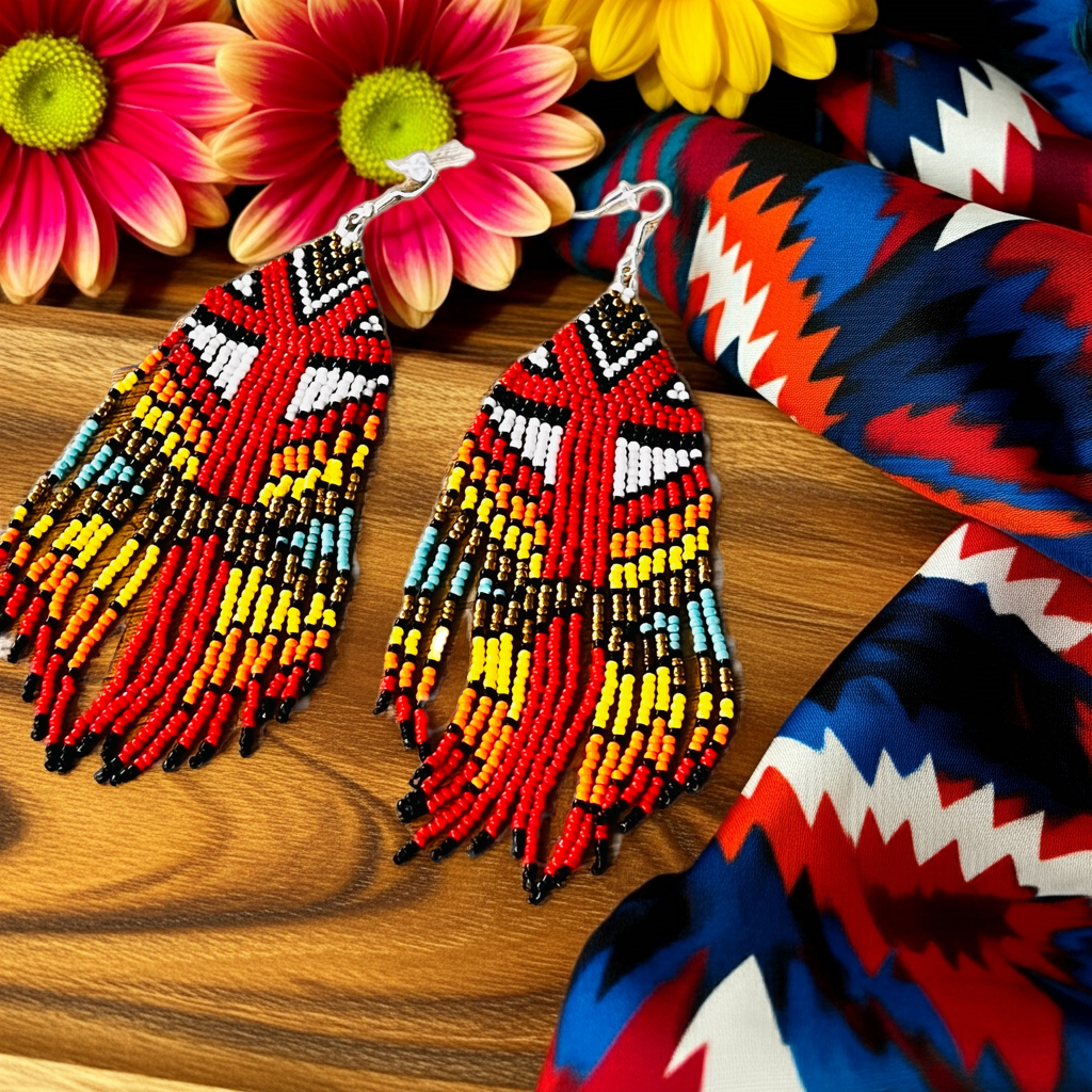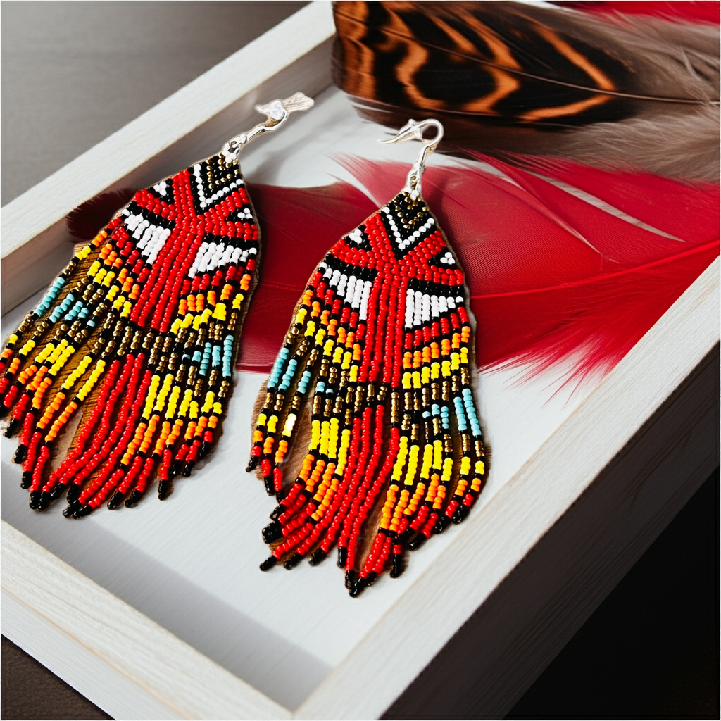 Elevate your style with these handcrafted Mocs N More Fancy Dancer earrings. Featuring a striking shawl-inspired design, the round glass beads in vibrant shades of red, black, white, orange, yellow, gold, and turquoise create a captivating palette. Measuring 5" by 1.75", these earrings are both bold and elegant. Crafted with hypoallergenic posts, they offer comfort without compromising on sophistication. A unique accessory that celebrates artistry and tradition with every detail.