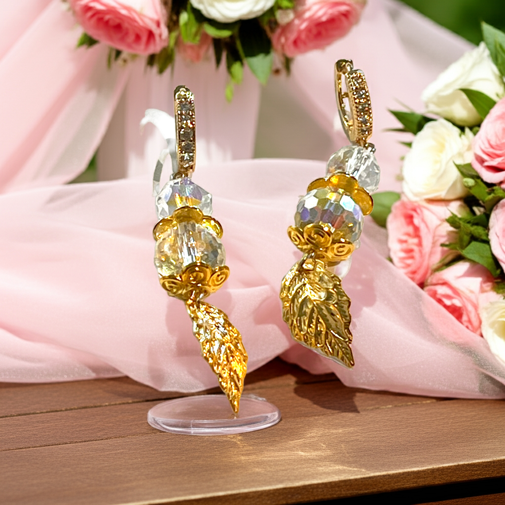 Elevate your style with the Golden Leaf Earrings from Mocs n More. Featuring delicate gold leaf charms paired with sparkling rhinestone leverback posts, these earrings combine elegance and secure comfort. The 8mm and 6mm glass beads, framed by refined golden bead caps, add a touch of subtle glamour. Expertly crafted in-house, these earrings embody timeless sophistication and quality.