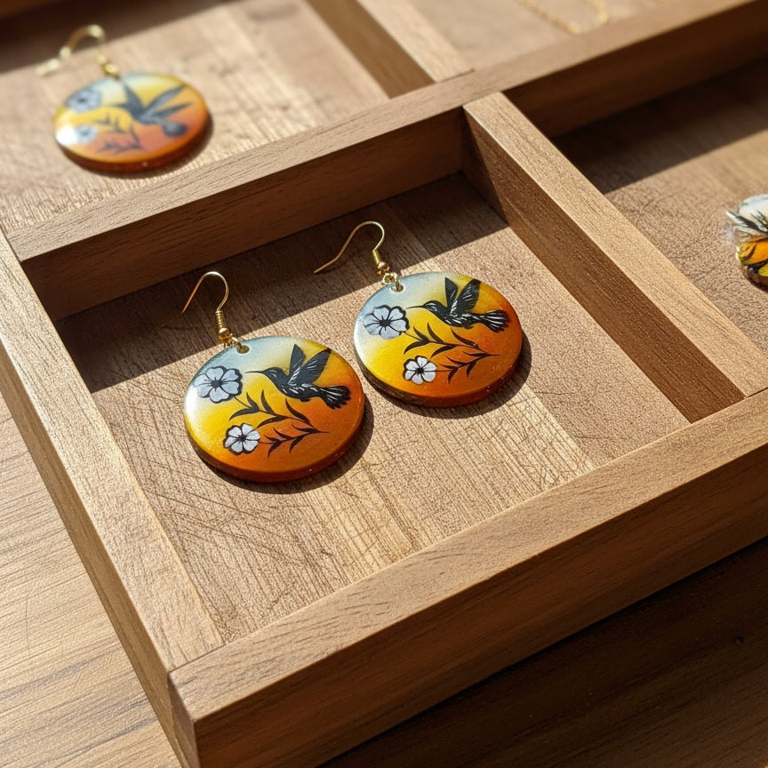 Handcrafted right here at Mocs N More, these stunning resin earrings feature a vibrant hummingbird and delicate flowers set in shimmering golden sparkles. Each 1.75-inch pair is individually hand-poured, sanded, and painted with meticulous care before being sealed with a protective clear coat. Because every piece is uniquely created by hand, no two pairs are exactly alike—making these earrings a one-of-a-kind addition to your collection.