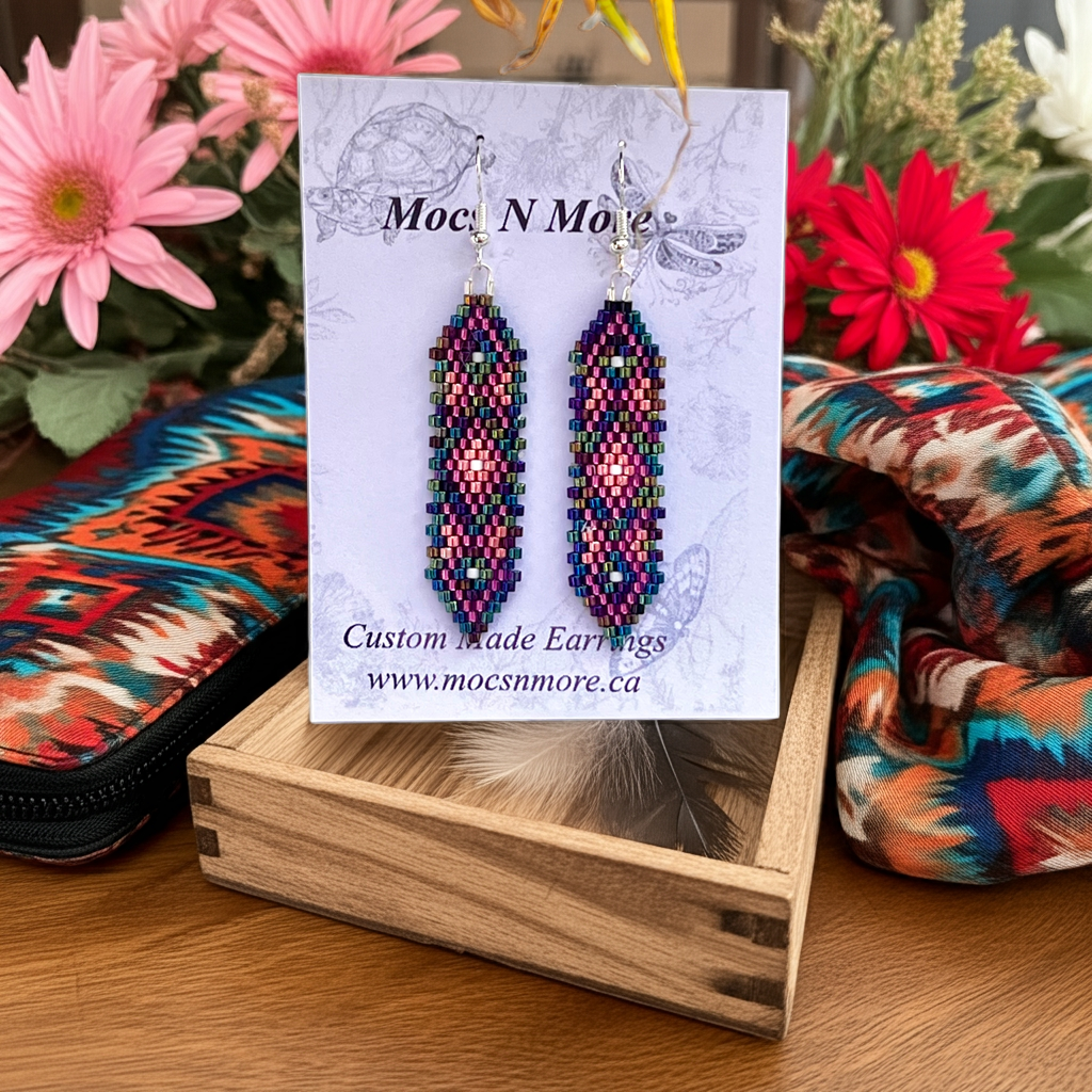 These elegant earrings feature 12 mm black metallic beads artfully combined with purple, metallic pink, and white beads. Measuring 1.5" by 1", they showcase an indigenous design crafted with care at Mocs n More, reflecting both sophistication and cultural heritage. Perfect for adding a refined touch to any ensemble.