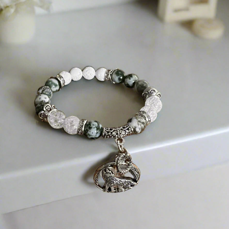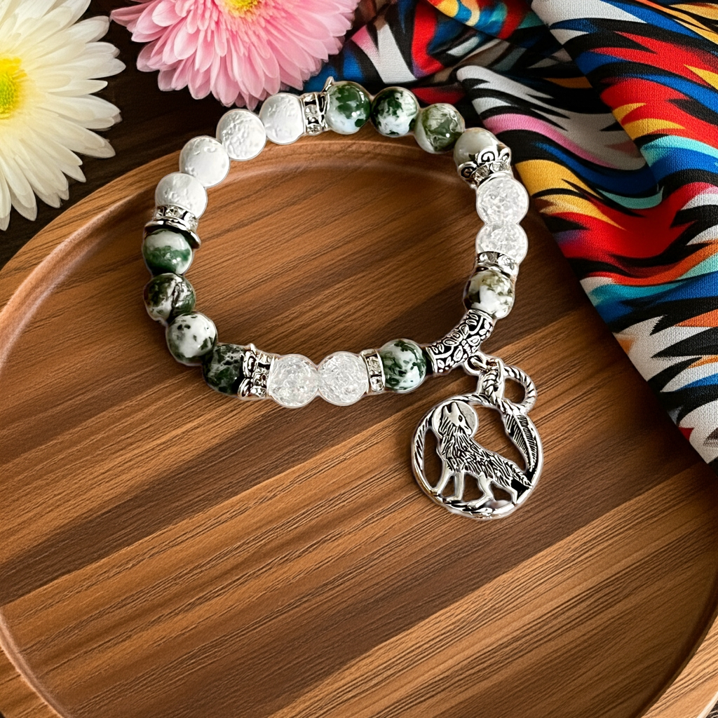 Enhance your inner strength and expression with Mocs N More Totem Elevate your inner strength and balanced well-being with our Mocs N More Totem Bracelets - featuring soothing Tree Agate gemstones & Cracked Quartz and the guiding Wolf totem. Tree Agate amplifies inner stability and promotes a strong immune system, while the Wolf totem guides you to trust your instincts and perceive life's challenges with clarity.