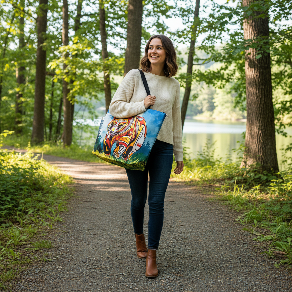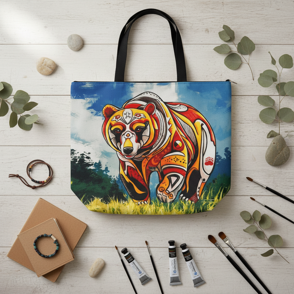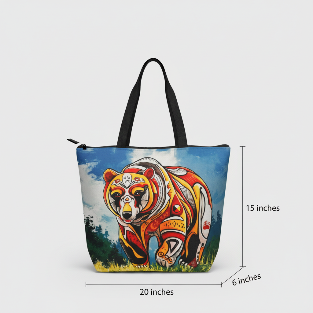 These authentic indigenous art tote bags are expertly crafted to be both stylish and functional. Made with durable canvas and featuring a generous size of 20 x 15 x 6, our tote bags are perfect for everyday use. With a fully lined interior, inside pocket, and zipper closure, they provide plenty of storage space and convenience. Plus, with each sale, the artist or copyright holder receives a royalty, supporting their work and culture.