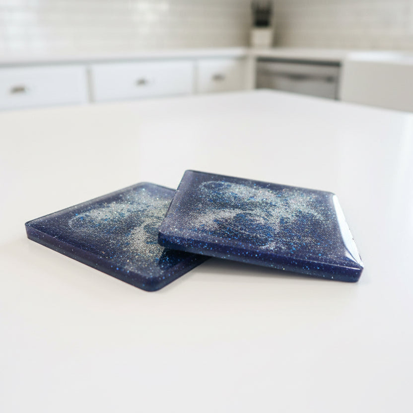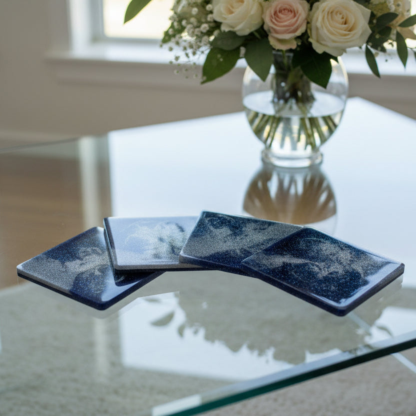 These stunning custom hand-poured epoxy resin coasters feature royal blue metallic sparkle with silver accents. Each coaster is carefully hand-crafted and hand-sanded for a smooth, premium finish, with a protective cork bottom to safeguard your furniture.