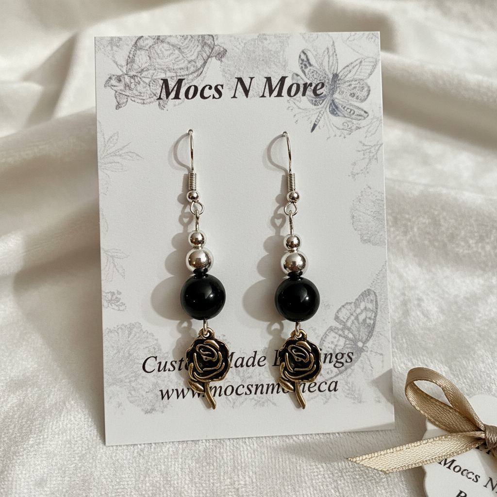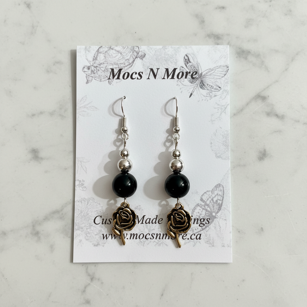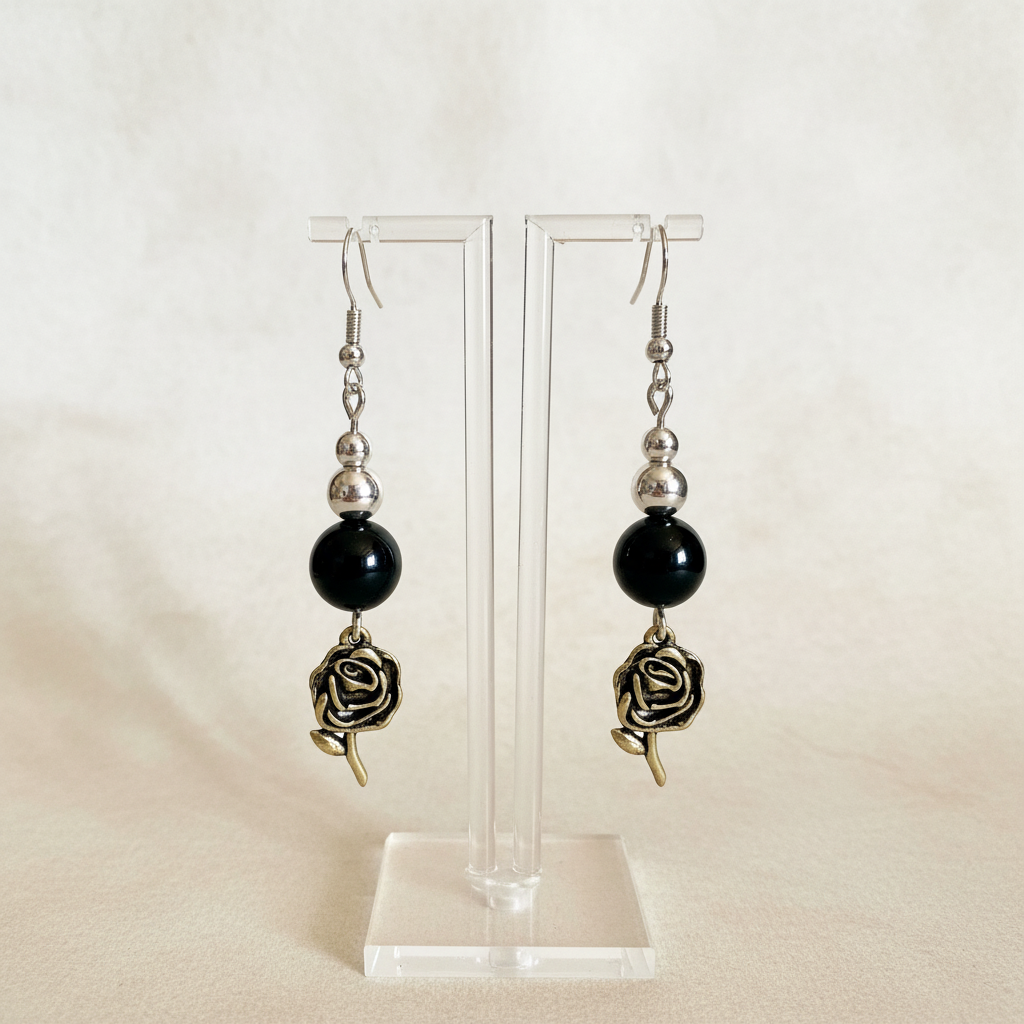 Materials: Black onyx, silver hematite, brass rose charm, hypoallergenic posts