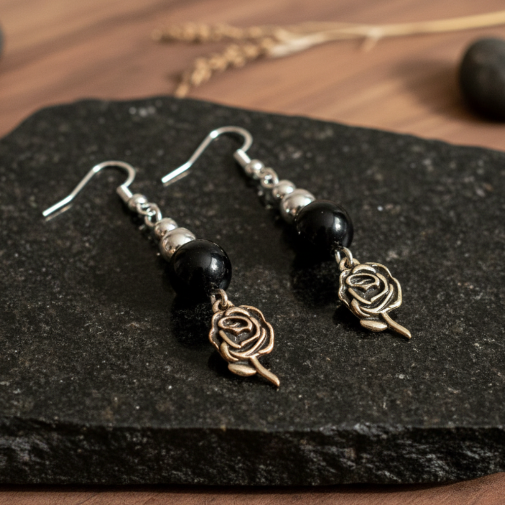 The Midnight Rose earrings combine the deep, sophisticated beauty of black onyx with the reflective shimmer of silver hematite beads, finished with a charming brass rose detail. These dangle earrings add a touch of elegance to any outfit while carrying the grounding properties of natural gemstones.