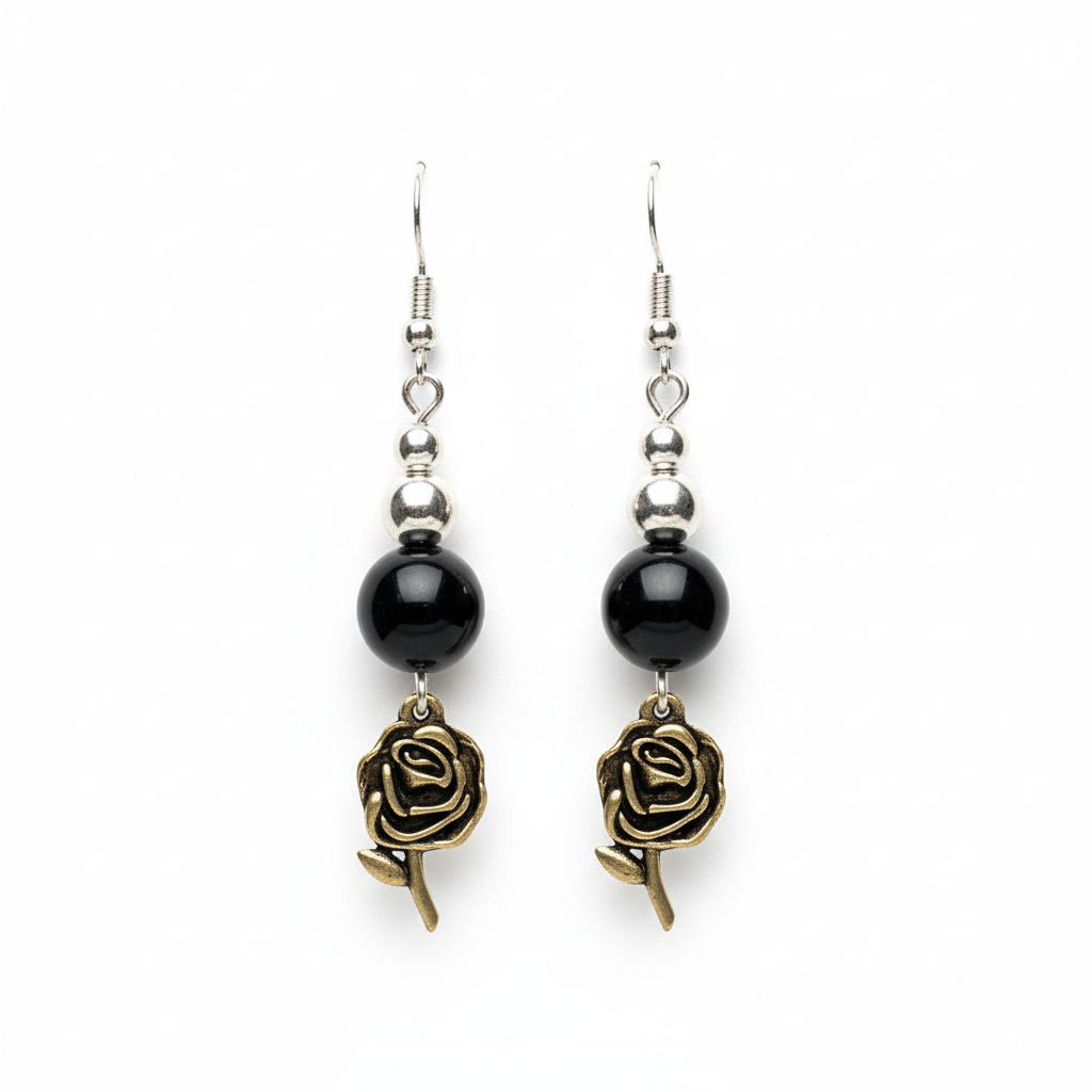 Elegant black onyx dangle earrings with a delicate rose charm accent