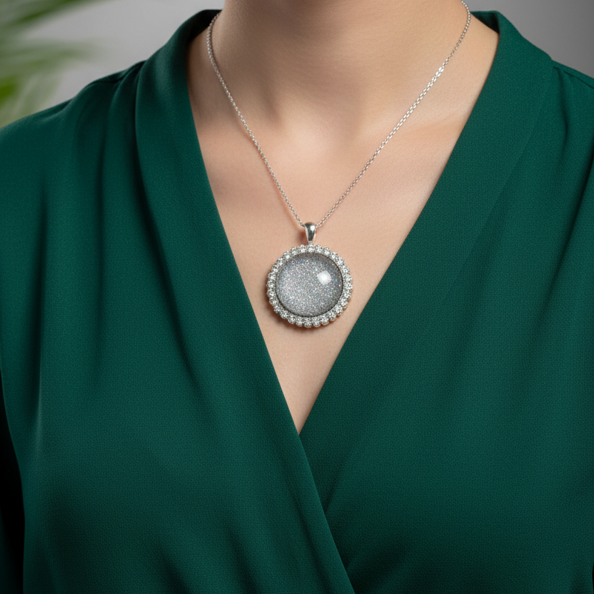 Shine bright with this dazzling handcrafted pendant necklace. The Brilliant features a stunning epoxy resin pendant with radiant sparkles that catch the light from every angle, creating a truly eye-catching effect.