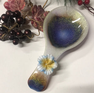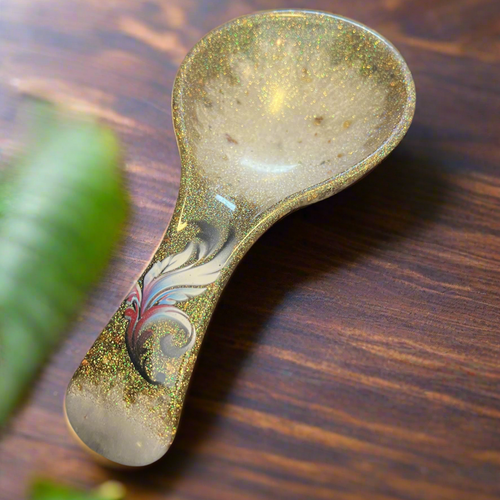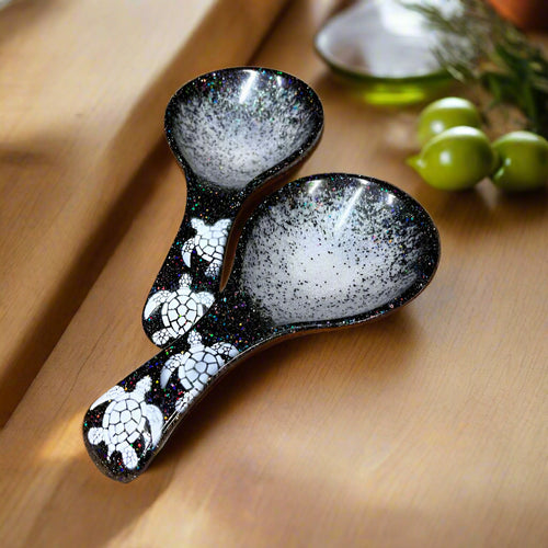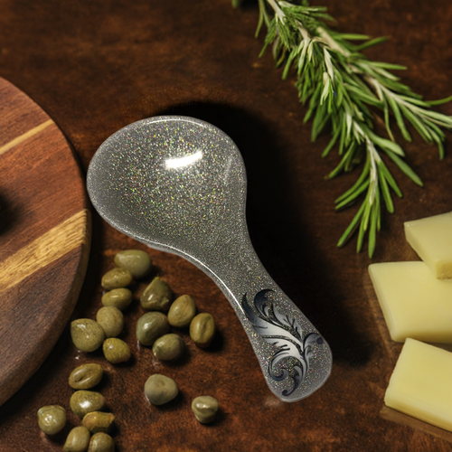 Introducing the Spoon Rests in Metallic Pearl with Blue, Violet, and Turquoise Sparkles. Crafted Right here at Mocs N More, these durable spoon rests add a cheerful iridescent touch to any kitchen. The eye-catching sparkles will brighten up mealtime at every turn.