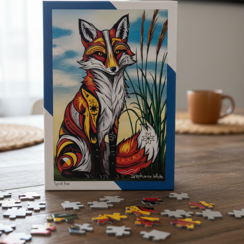 Bring the magic of Indigenous art into your home with this beautiful 1000-piece puzzle featuring Spirit Fox by artist Stephanie White. Captivating and full of spirit, this puzzle is a joy to assemble and a stunning piece to display when complete.