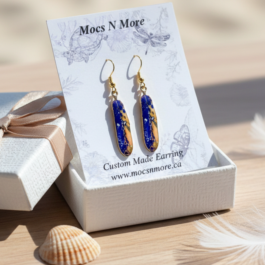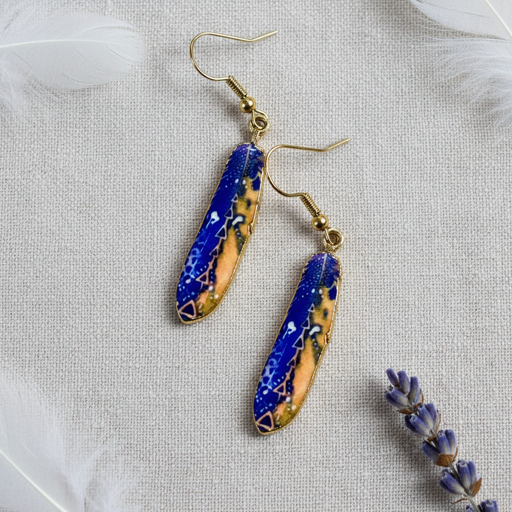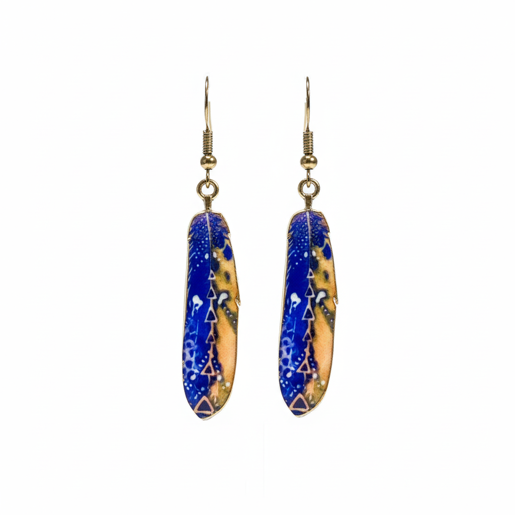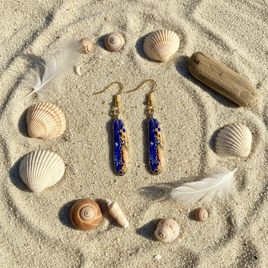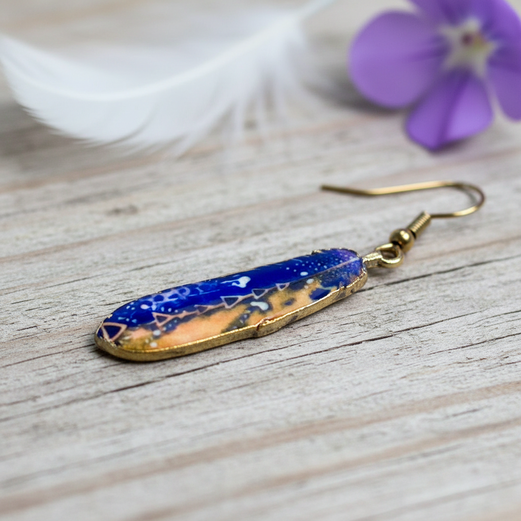 The Coastal Spirit earrings capture the essence of where ocean meets shore. Each brass feather features a beautiful dual-tone design - one side evokes the deep royal blue of ocean waters with hints of white foam, while the reverse showcases warm tan and white sand tones. These earrings bring the peaceful energy of the coastline to your everyday style.