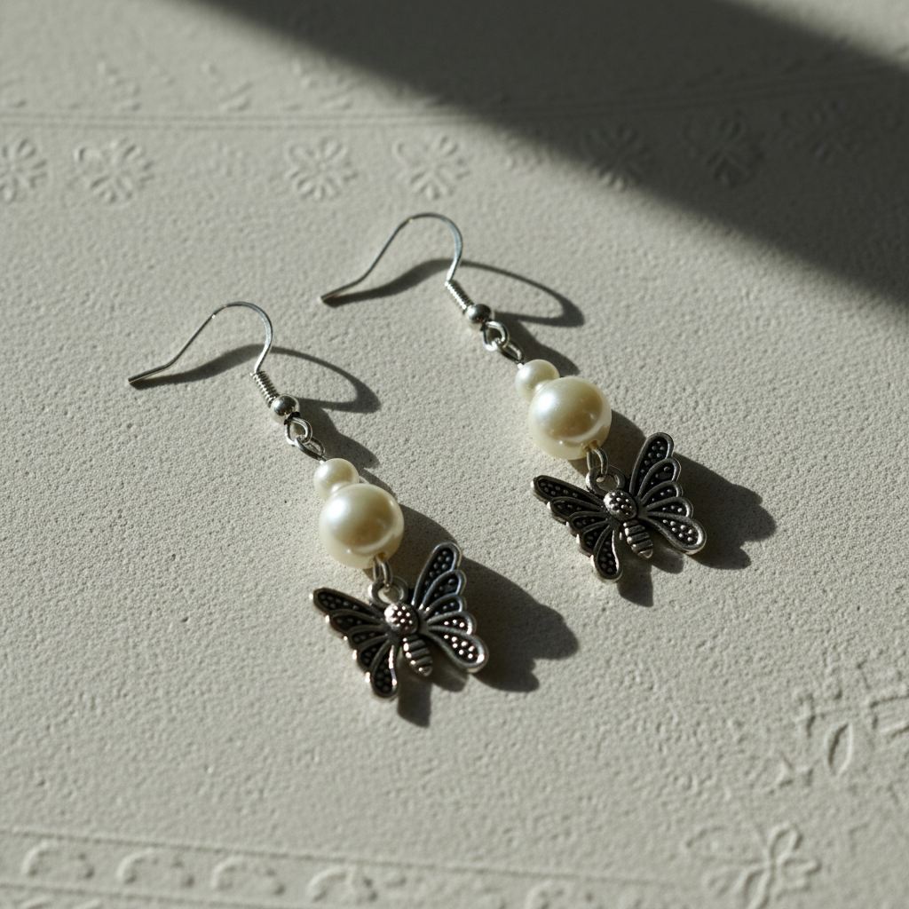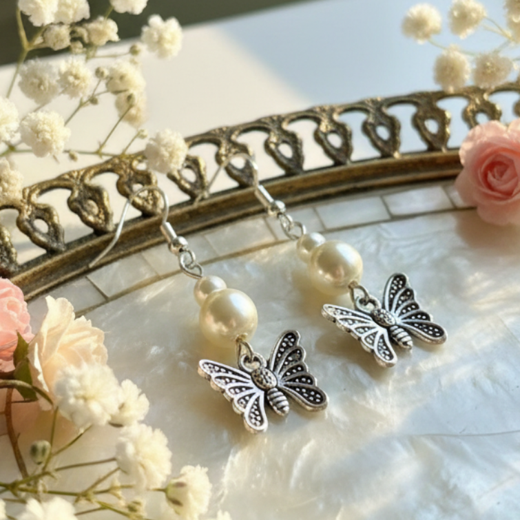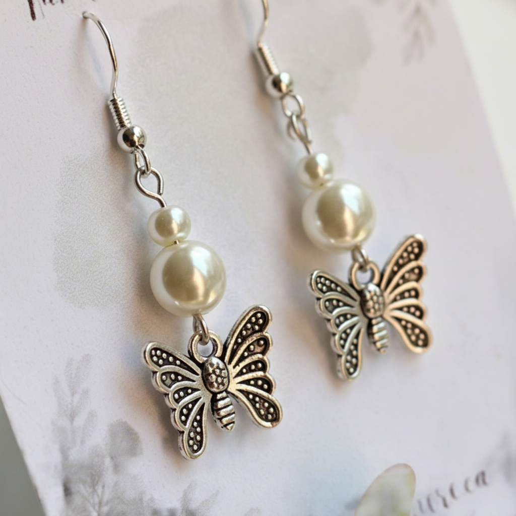 Introducing Mocs N More Earrings, handmade with real 6mm and 2mm pearl beads for an elegant touch. Hypoallergenic posts make them suitable for anyone. The beautiful butterfly charm adds a touch of transformation, symbolizing change and growth. Elevate your style with these luxurious earrings.
