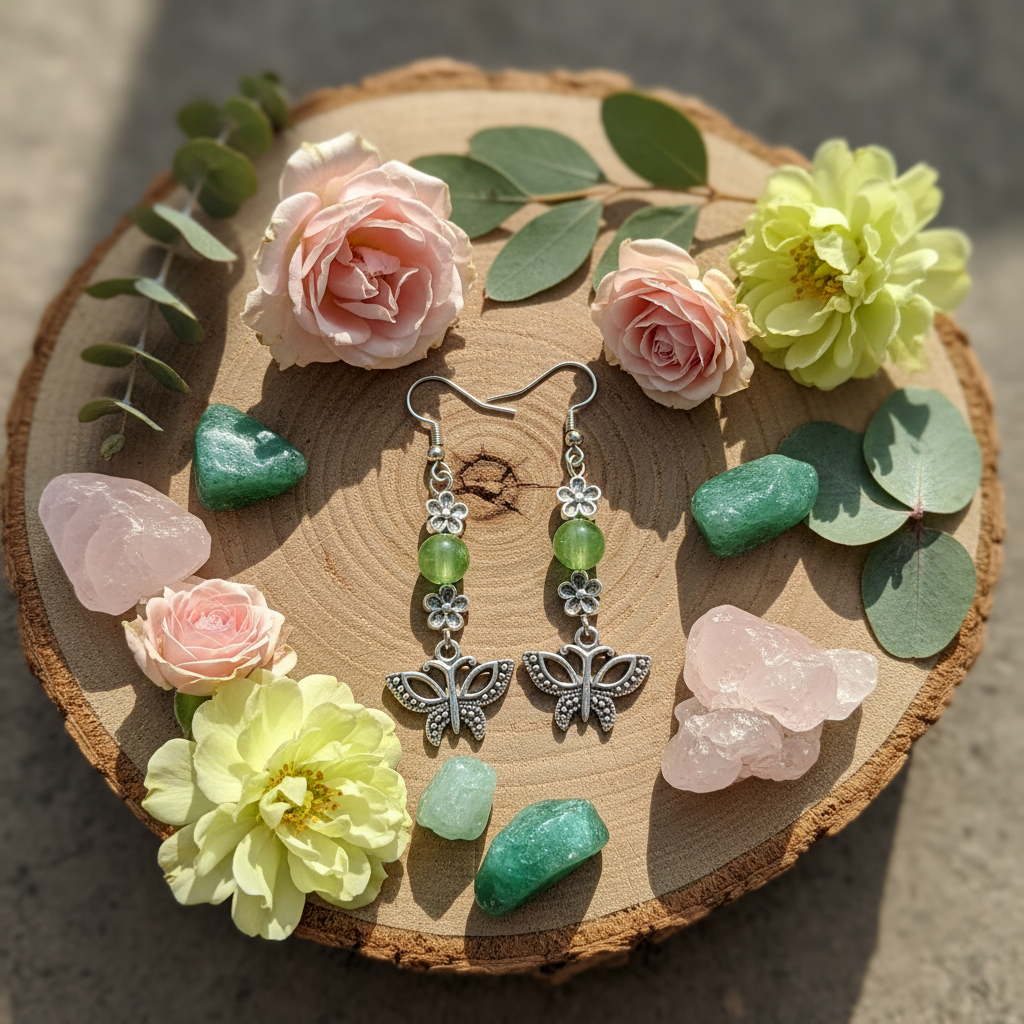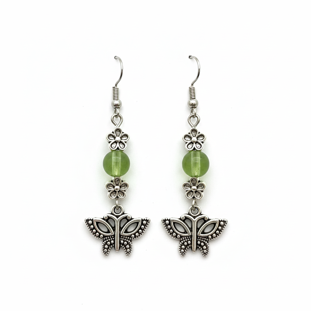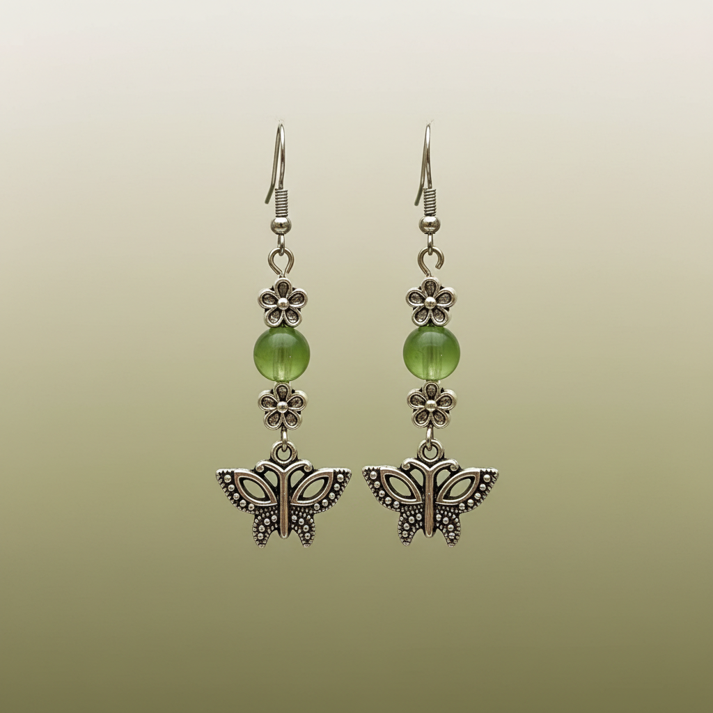 The Soul Journey earrings honor the sacred path of transformation and spiritual growth. The butterfly represents the soul's metamorphosis - from earthbound caterpillar to winged beauty, symbolizing rebirth, joy, and the courage to embrace change. The delicate flowers speak to the unfolding of consciousness and new beginnings, while the olive green beads connect to the heart chakra, bringing peace, harmony, and natural healing energy.