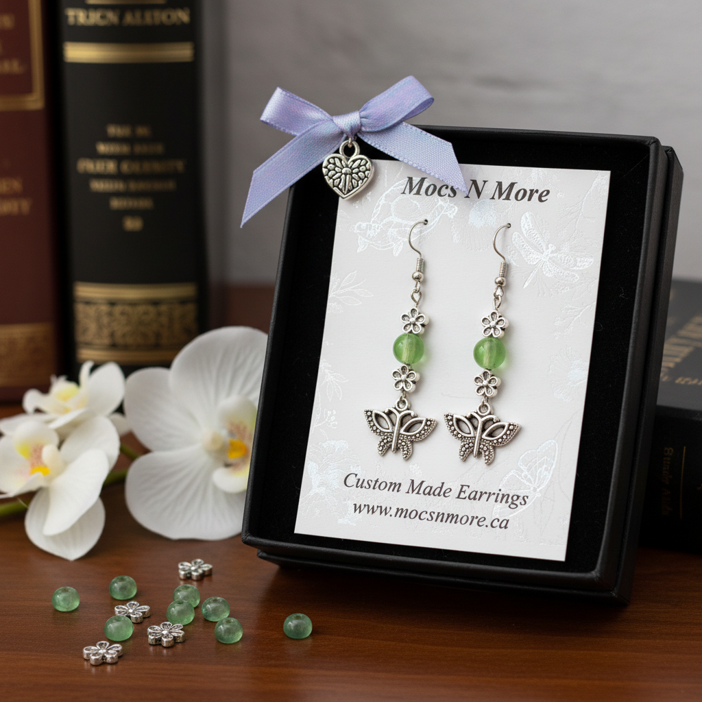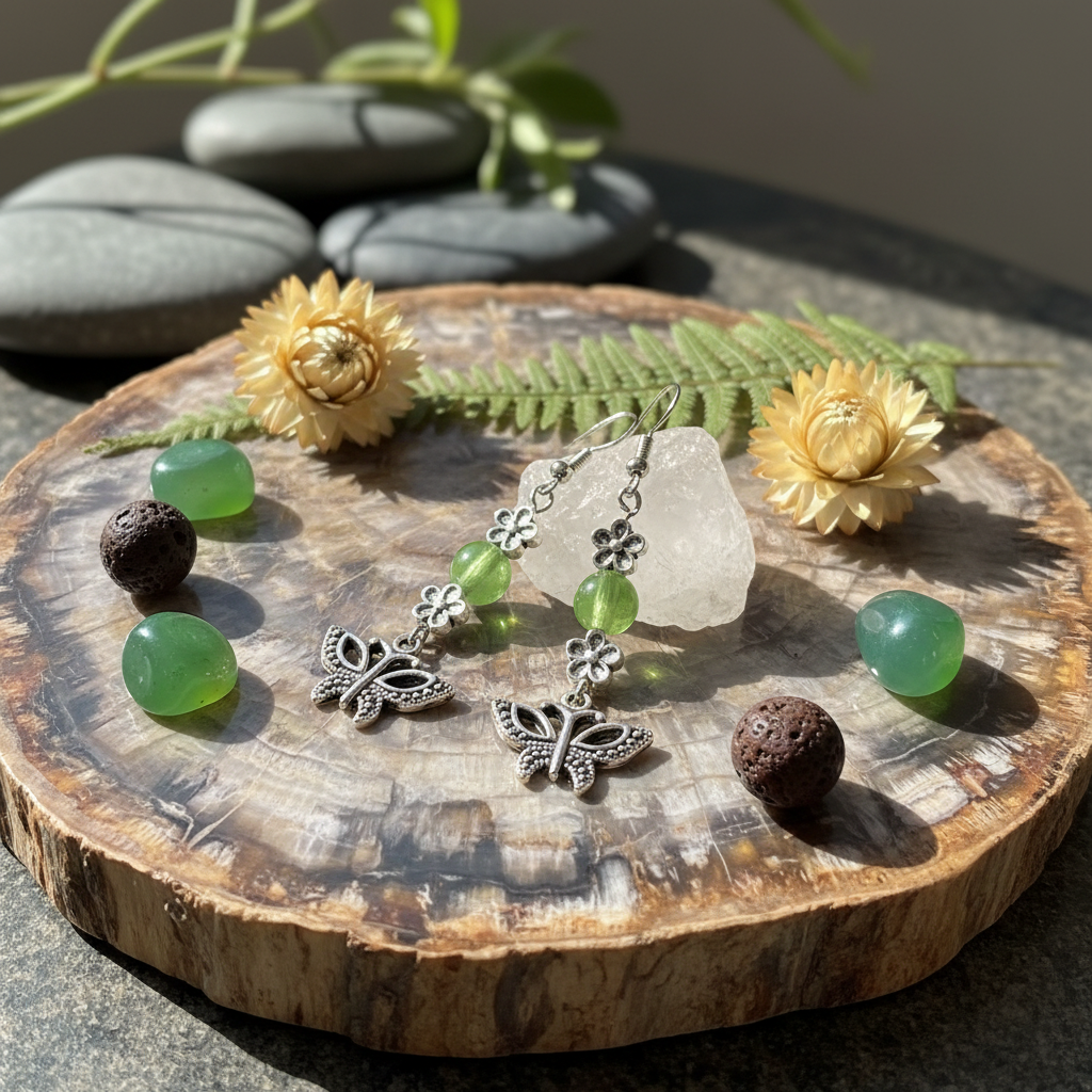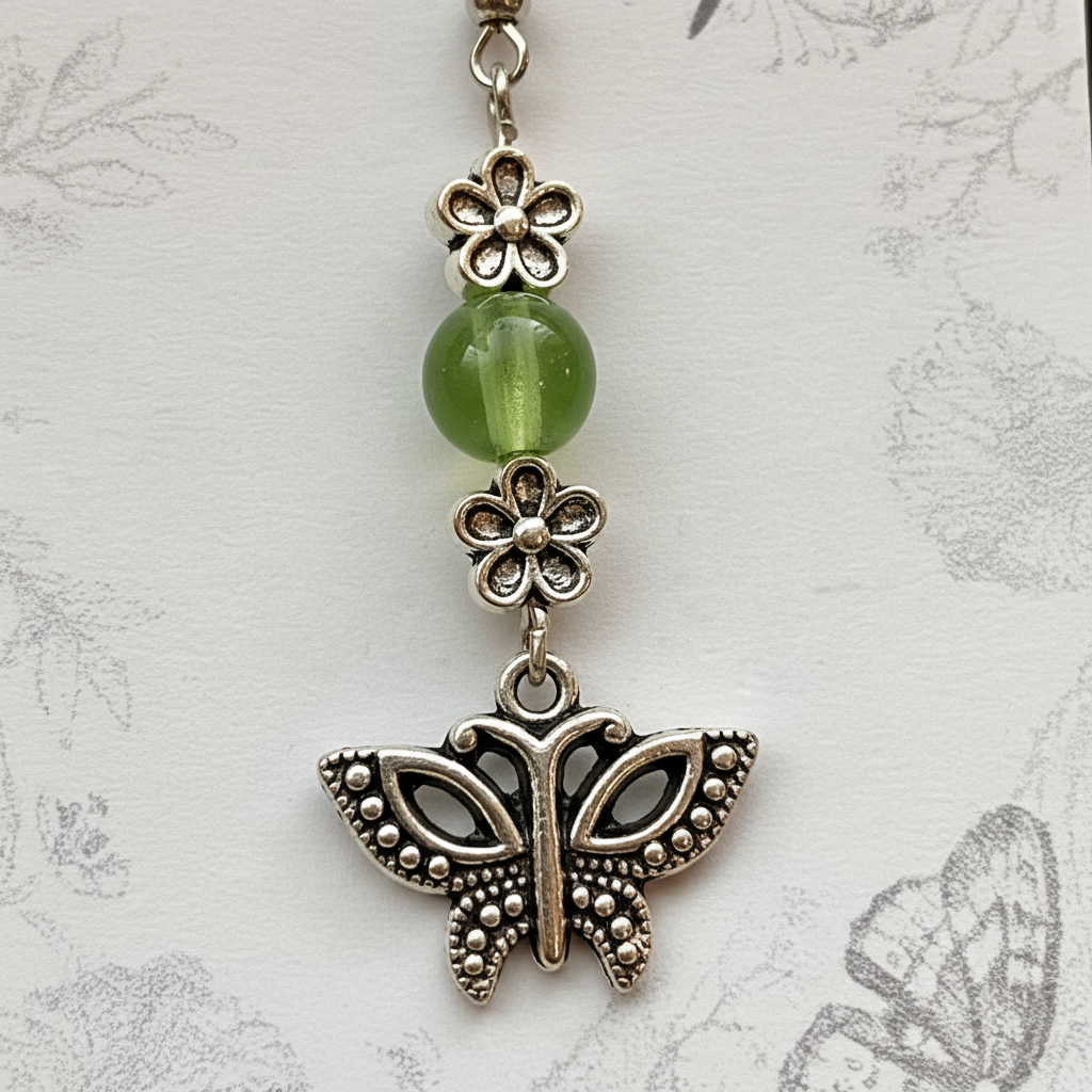 The Soul Journey earrings honor the sacred path of transformation and spiritual growth. The butterfly represents the soul's metamorphosis - from earthbound caterpillar to winged beauty, symbolizing rebirth, joy, and the courage to embrace change. The delicate flowers speak to the unfolding of consciousness and new beginnings, while the olive green beads connect to the heart chakra, bringing peace, harmony, and natural healing energy.