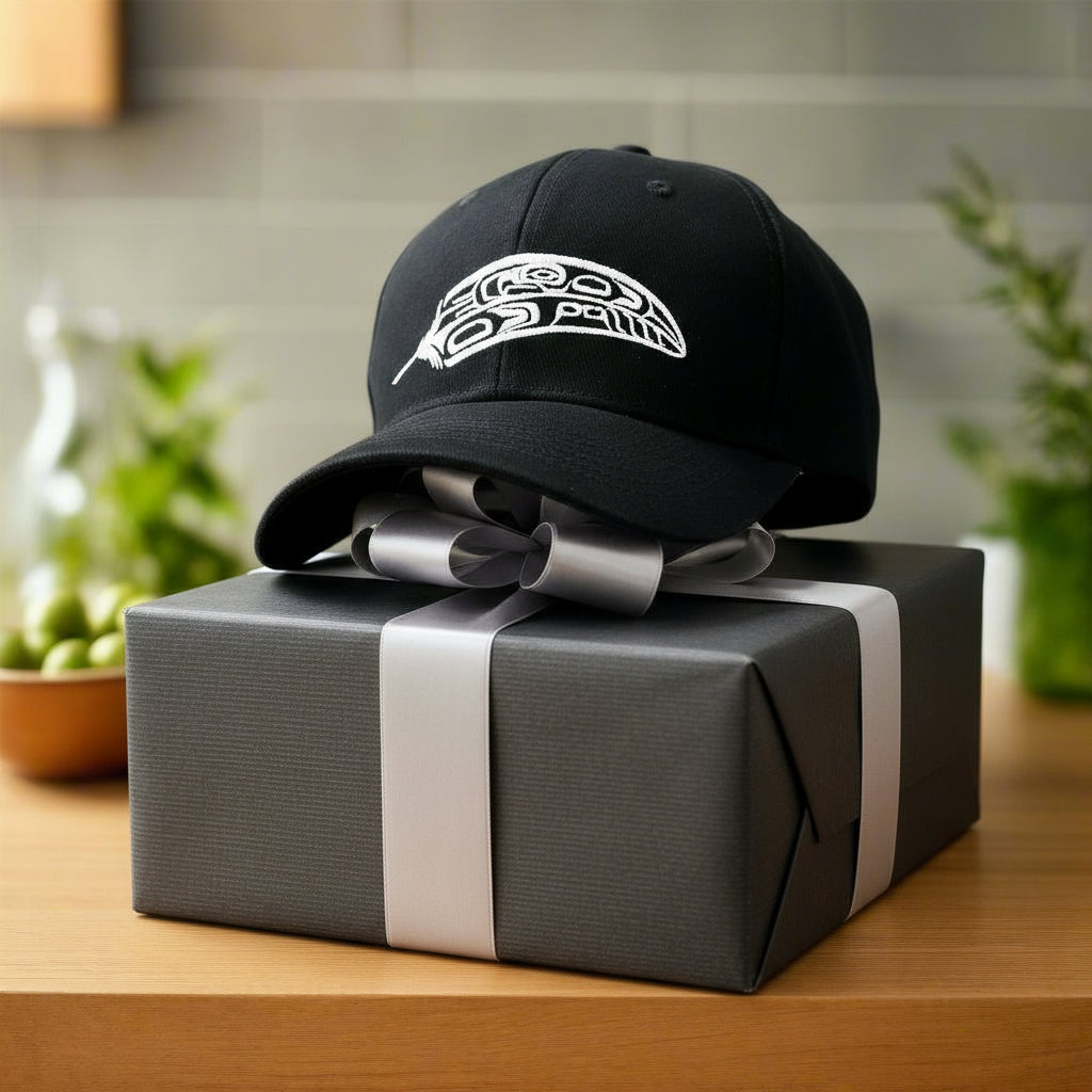 A black adjustable cap with a white embroidered design on the front, placed on a wooden surface with foliage in the background.