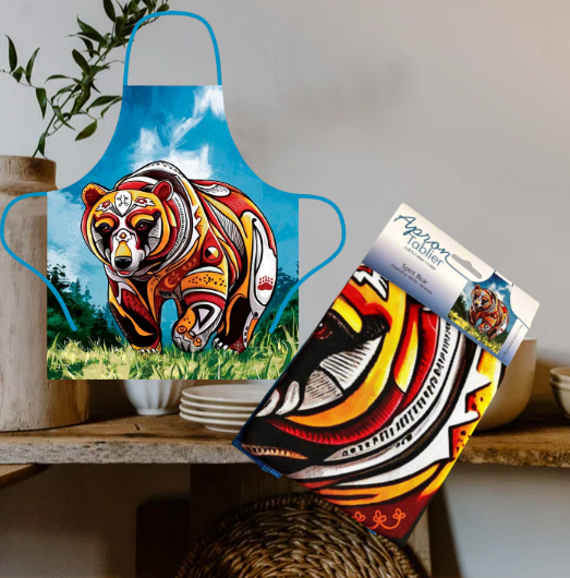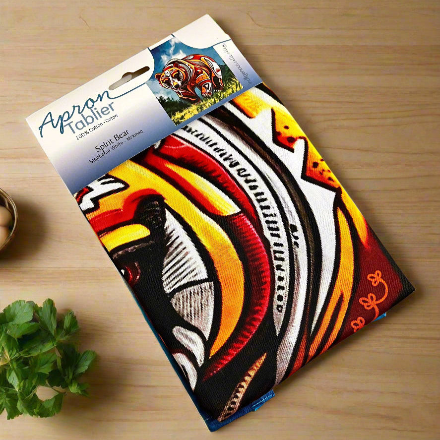This apron, made from 100% cotton and measuring 26.8" x 31.5", showcases authentic Indigenous artwork by Mi'kmaq Artist Stephanie White. Each sale includes a royalty payment to the artist, supporting her creative work. Combining quality fabric with culturally significant design, this apron offers both practical use and meaningful artistic expression.