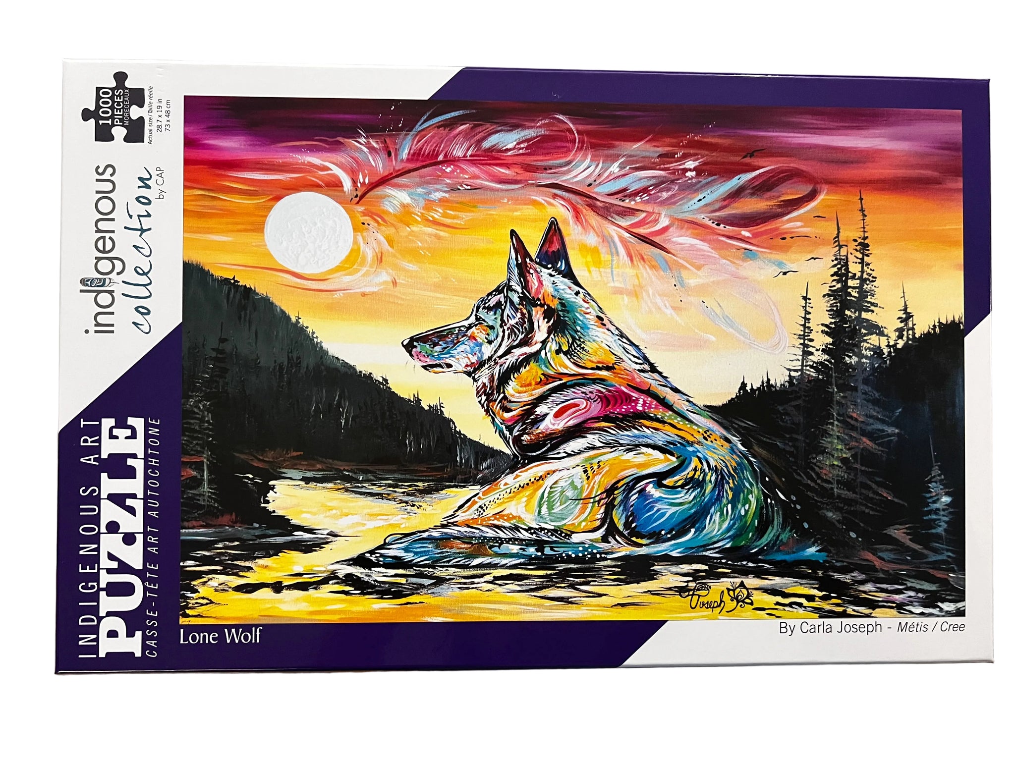 Bring the spirit of the wild into your home with this striking 1000-piece puzzle featuring Lone Wolf by Métis Cree artist Carla Joseph. Bold, evocative, and full of meaning — this puzzle is as rewarding to assemble as it is beautiful to display.