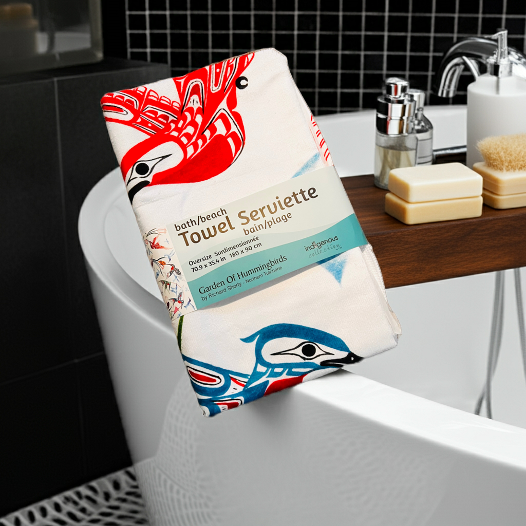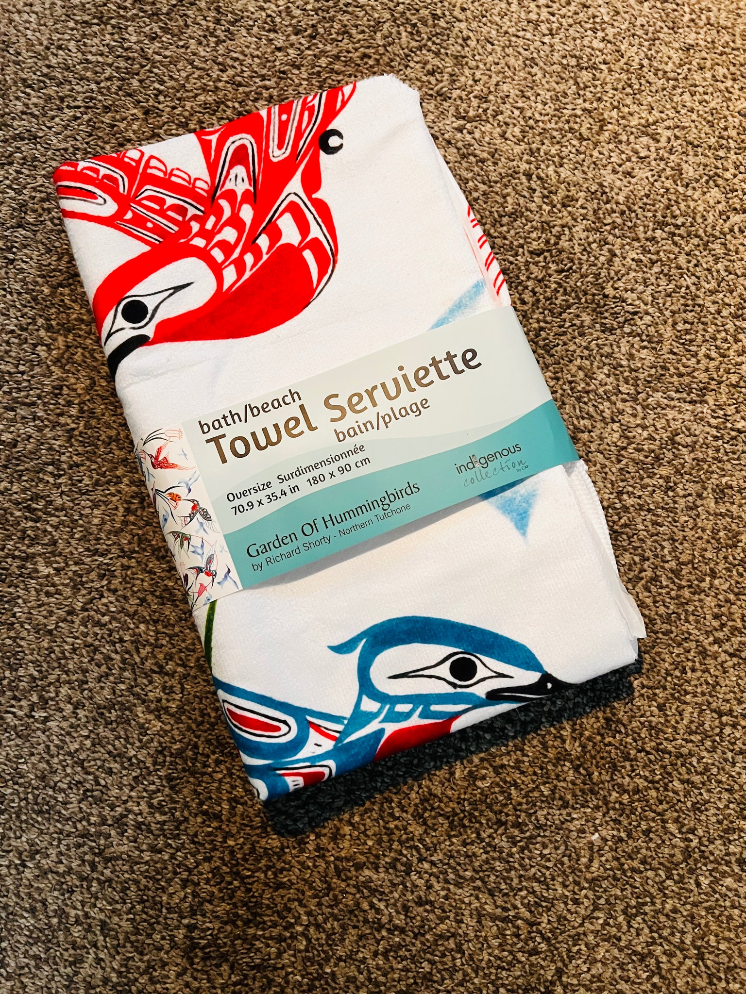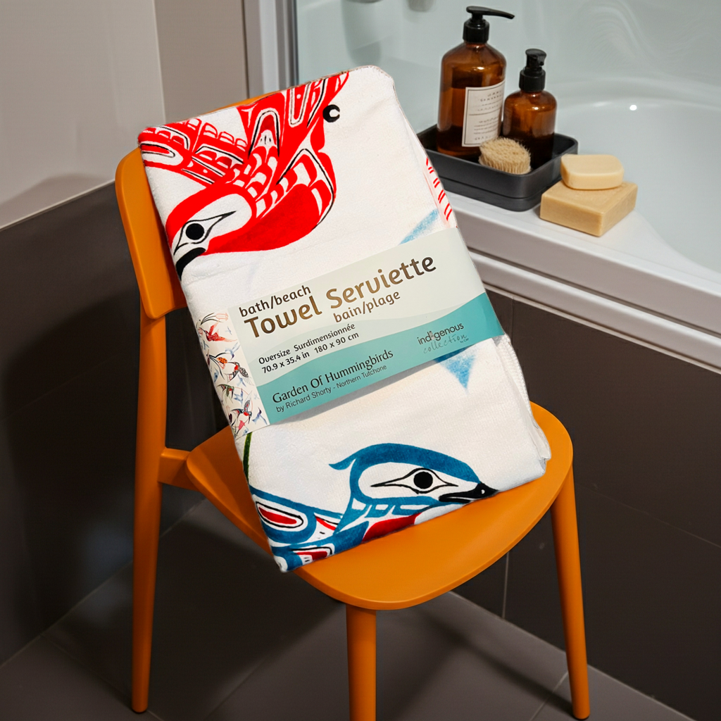 Introducing our luxurious Bath Towels - Garden of Hummingbirds.  Measuring 70.9"x35.4", these indigenous designed towels are crafted from 100% polyester micro fibre for an ultra-soft and absorbent experience. Perfect for both bath and beach, this huge towel makes an excellent gift and adds a touch of elegance to any bathroom. Treat yourself to the oversized comfort of our Bath Towels.