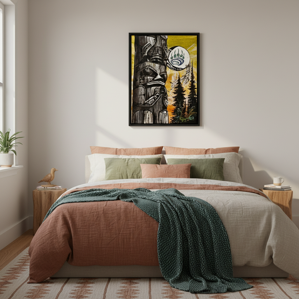 Celebrate the strength and wisdom of the Bear Clan through Karen Erickson's stunning artwork. This limited edition framed canvas honors Indigenous traditions and the powerful symbolism of the bear in Indigenous culture.