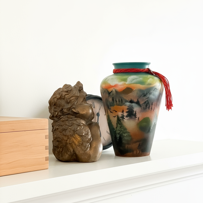 Decorative items including a vase with a nature design, a wooden box, and a stone lion figure on a white surface.