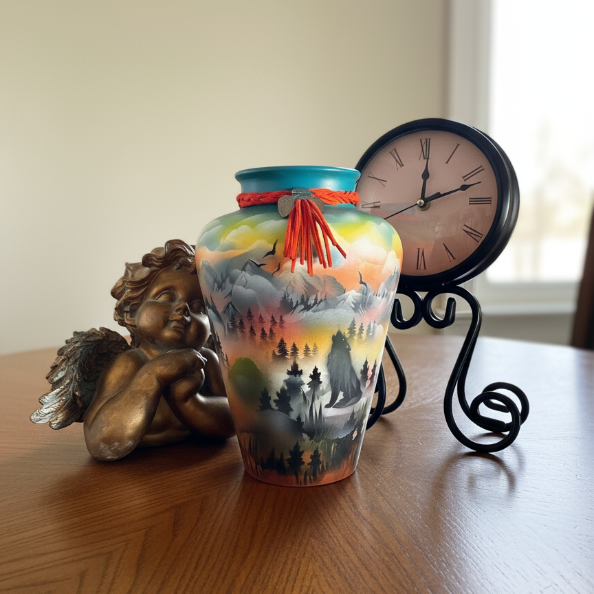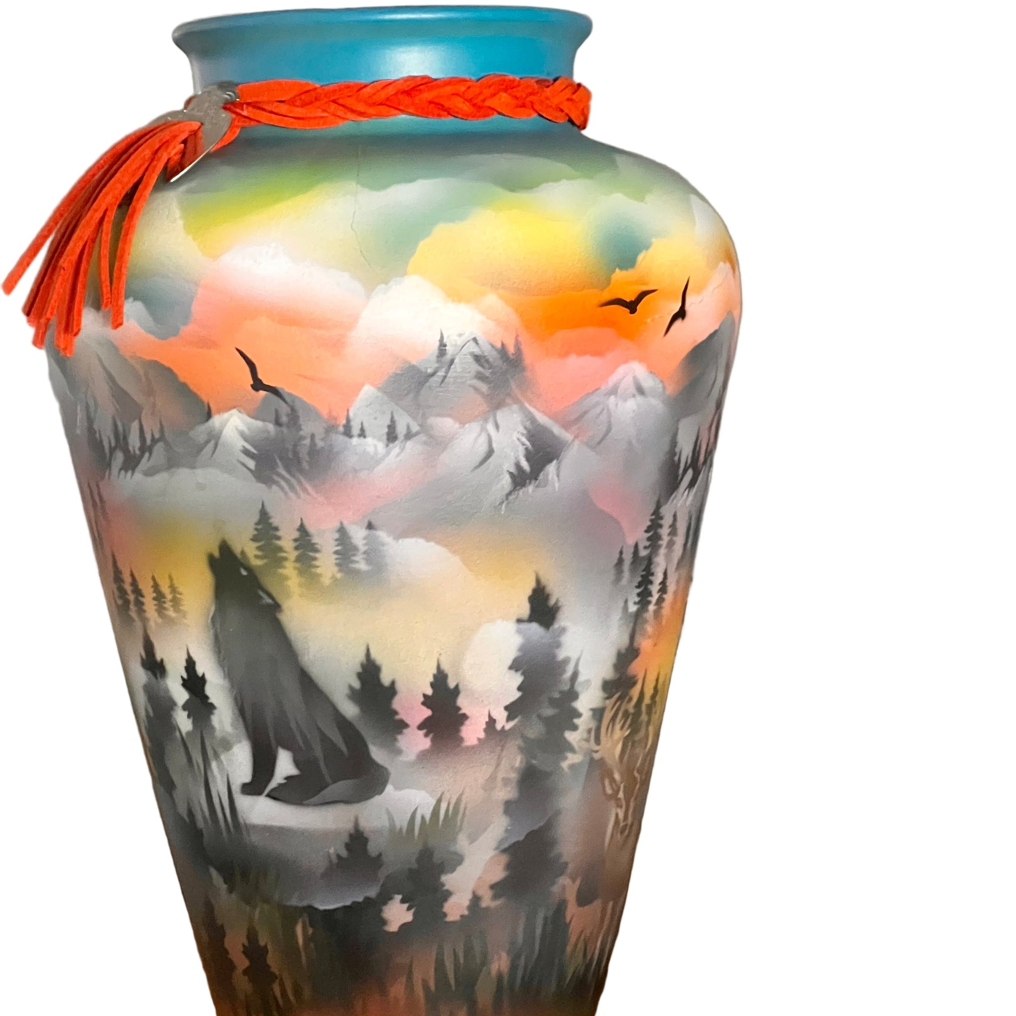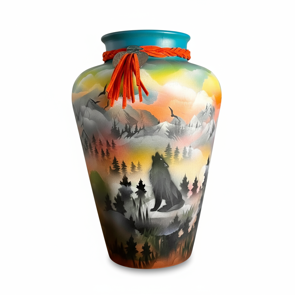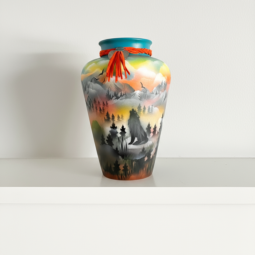 A breathtaking celebration of nature's majesty. This exceptional ceramic vase showcases the artistic vision of White Bear, a Cree Nation artist who captures the spirit of the wild through masterful hand-painted imagery. Wolves, eagles, and deer move gracefully across a sweeping panorama of mountains bathed in golden sunset hues.