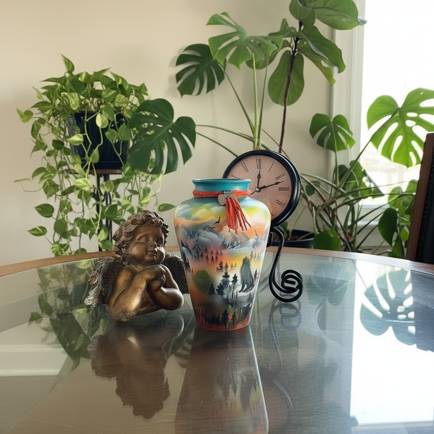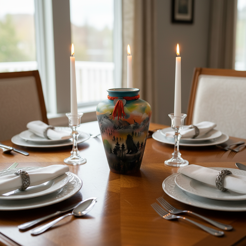 This isn't just a decorative vase – it's a piece of living Indigenous art that brings the reverence and beauty of nature into your home. The sweeping landscape and wildlife imagery reflect the deep connection between Indigenous culture and the natural world. Display it as a striking focal point in your living room, office, or gallery wall.