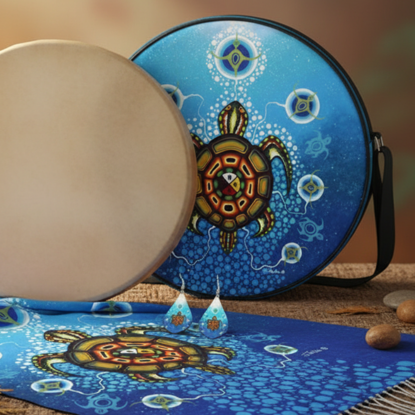 The Turtle is sacred in the indigenous culture. It carries the four colours of the medicine wheel, symbolizing important elements and can be different depending on the tribe. The seven circles represent the seven teachings of our people, and inside each circle is a bird that delivers the message of the creator..