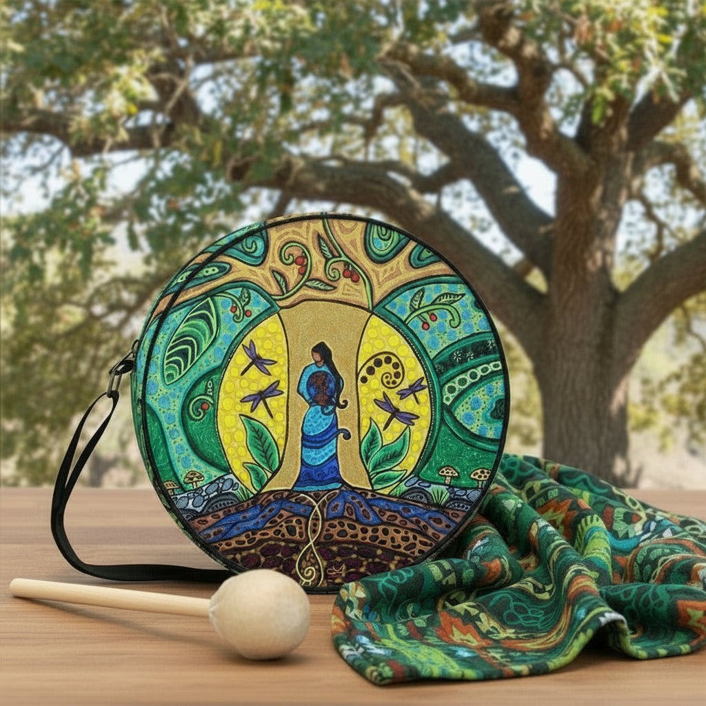 Celebrate the powerful bond between women and the earth with the Strong Earth Woman 14" drum bag, designed by Métis artist Leah Dorion. This vibrant bag reminds us that balance—physical, emotional, mental, and spiritual—is the key to well-being. Perfect for carrying your drum with a touch of soulful energy and style!