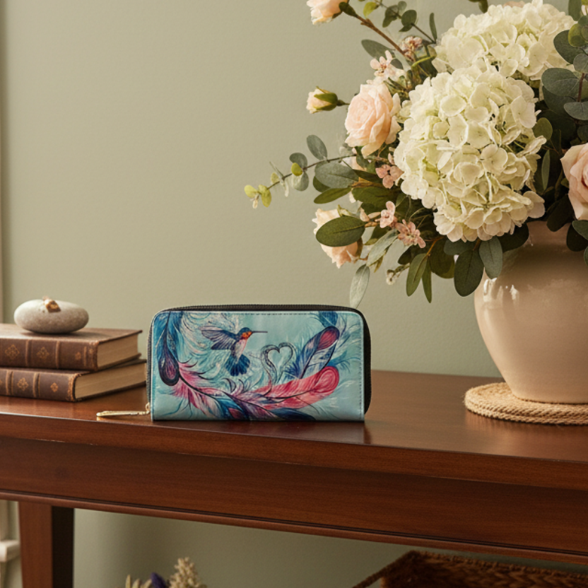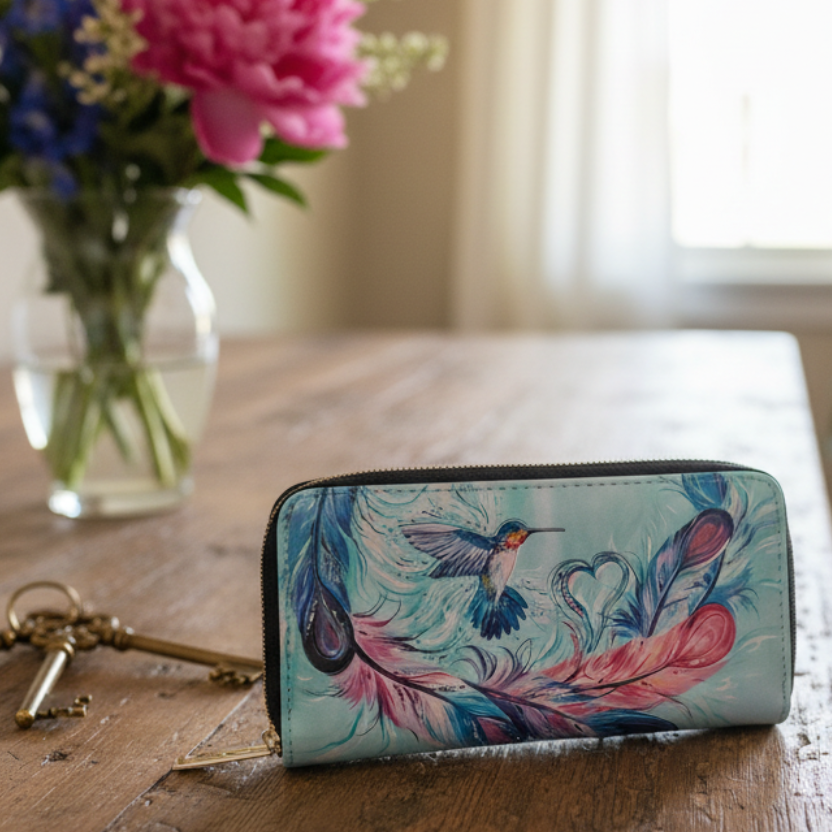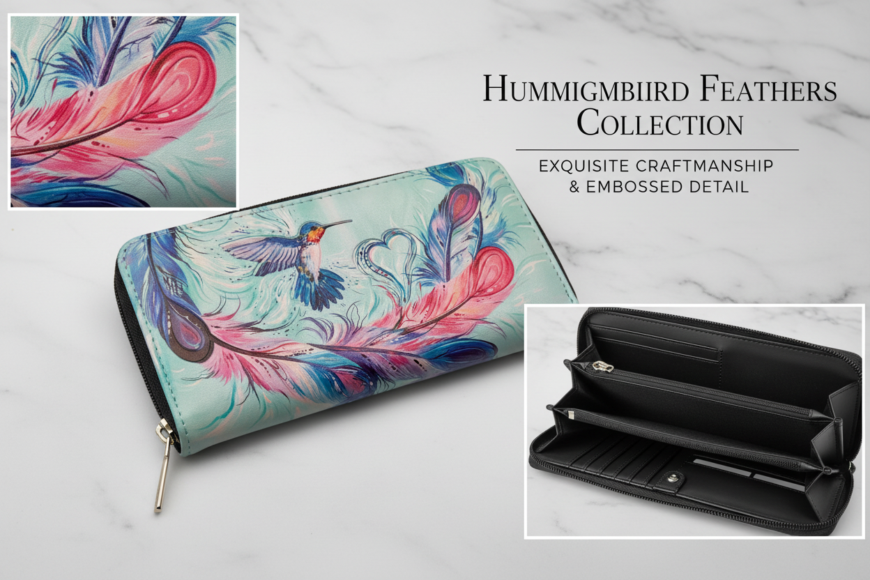 Hummingbird Feathers Embossed Wallet by Carla Joseph - Métis/Cree