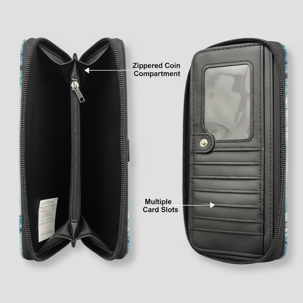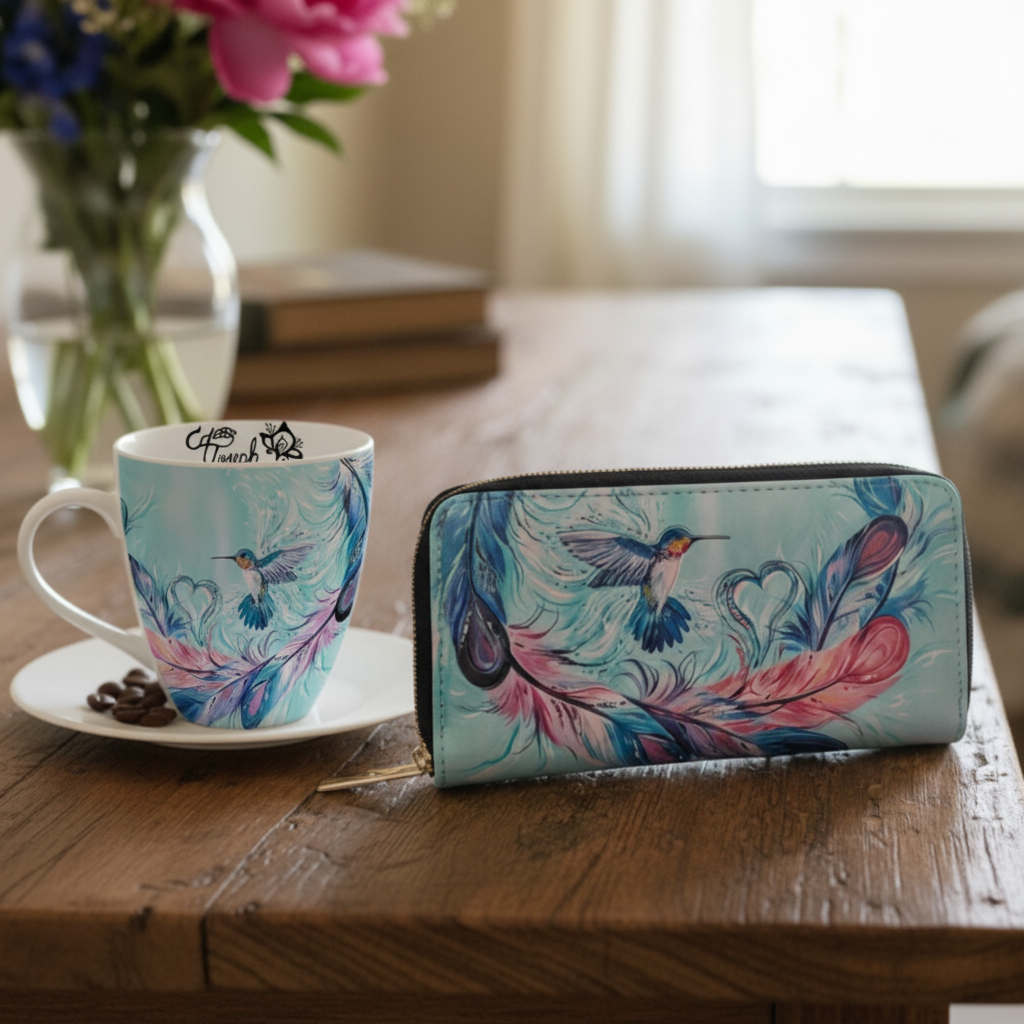 Carry the beauty of Indigenous art with you every day. This stunning wallet features the Hummingbird Feathers design by artist Carla Joseph - Métis/Cree, beautifully embossed on both sides.