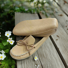 A pair of beige men's moose hide moccasins with an adjustable lace and a triple sole design, displayed on a wooden floor.