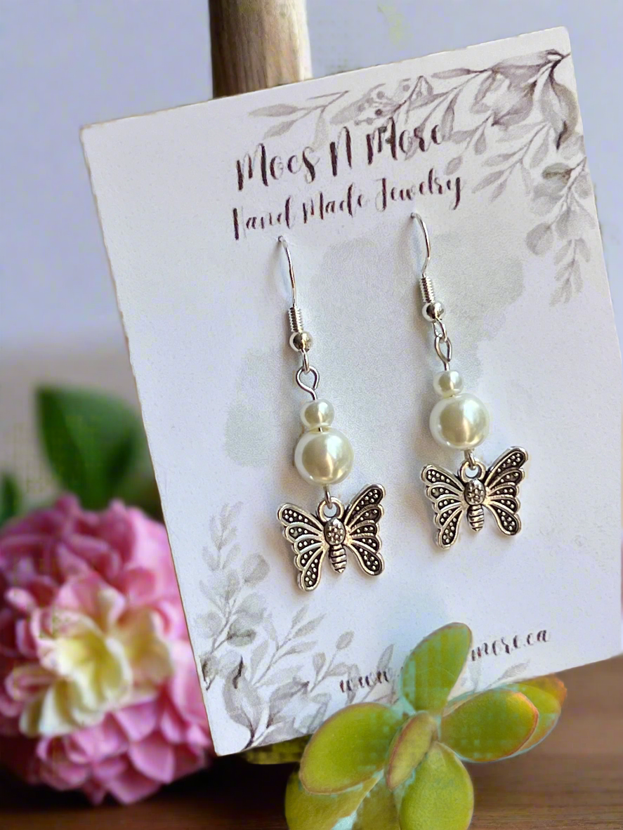 Introducing Mocs N More Earrings, handmade with real 6mm and 2mm pearl beads for an elegant touch. Hypoallergenic posts make them suitable for anyone. The beautiful butterfly charm adds a touch of transformation, symbolizing change and growth. Elevate your style with these luxurious earrings.