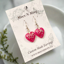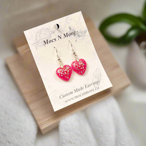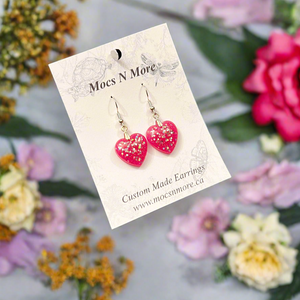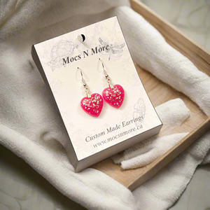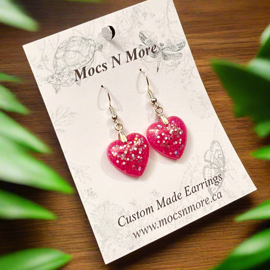 Elevate your style with our Mocs N More Earrings in sparkling fuchsia. Handcrafted with epoxy resin, these heart-shaped earrings are custom made for a truly unique accessory. The hypoallergenic design ensures comfort, making them perfect for a night out or any occasion.